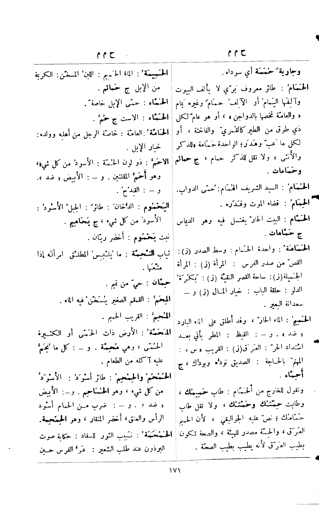 الحمام: طائر معروف بري لا يألف البيوت وآلفها اليمام أو الآلف حمامٌ وغيره يمام "والعامة تخصها بالدواجن"، أو هو عام لكل ذي طوق من الطير كالقمري والفاختة، أو لكل ما عب وهدر؛ الواحدة حمامة "للذكر والأنثى" ولا تقل للذكر حمام، ج حمائم وحمامات.
