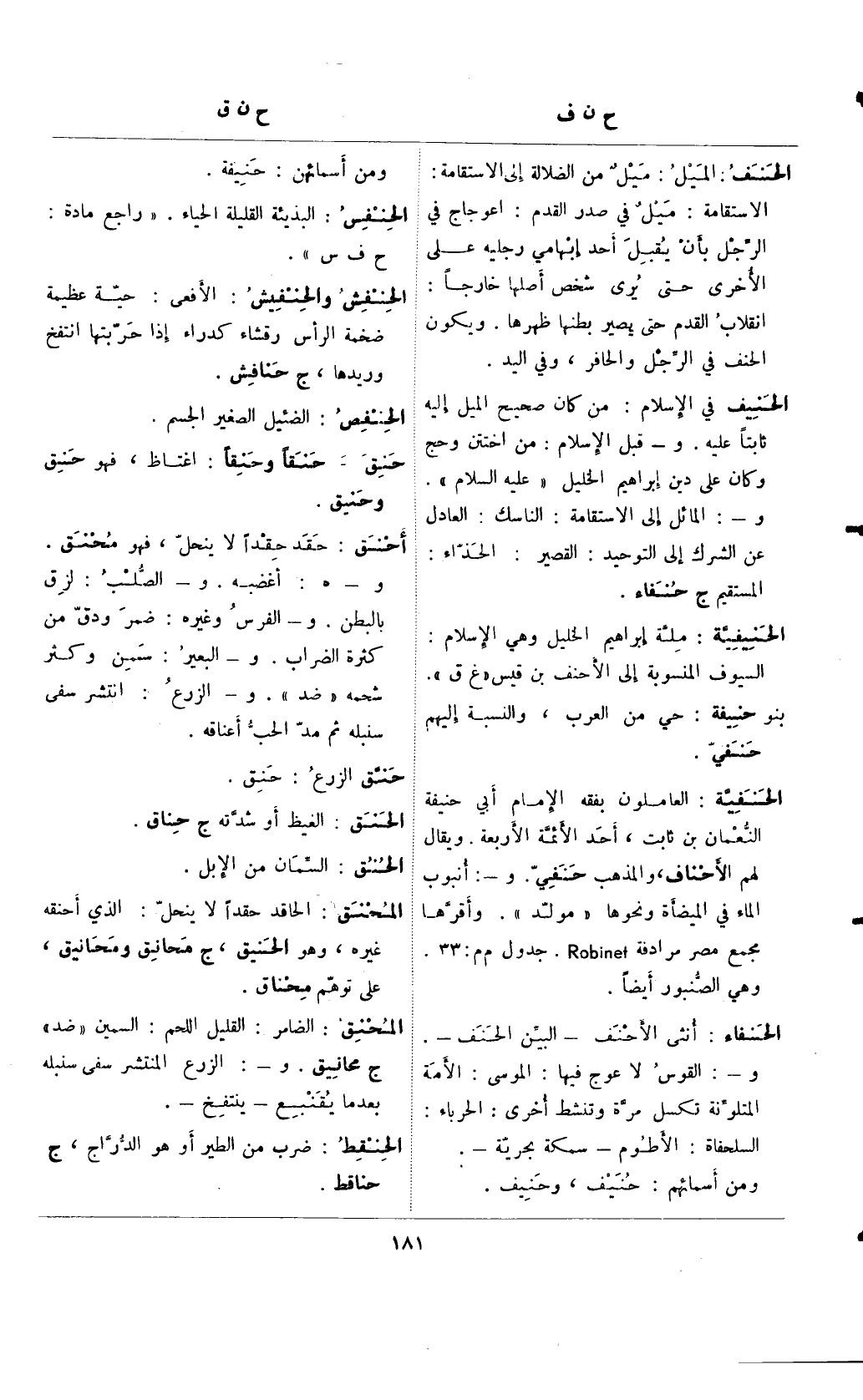 الحنفية: العاملون بفقه الإمام أبي حنيفة النعمان بن ثابت، أحد الأئمة الأربعة. ويقال لهم الأحناف، والمذهب حنفي. و-: أنبوب الماء في الميضأة ونحوها "مولد". وأقرها مجمع مصر مرادفة Robinet. جدول م م: 33. وهي الصنبور أيضًا.