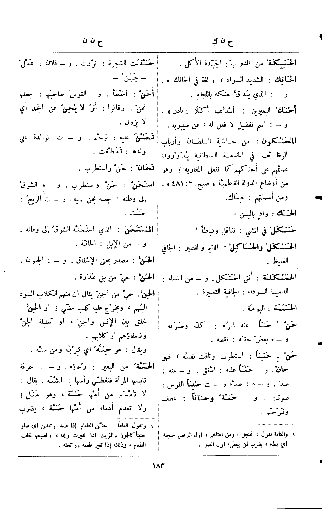 حن- حنينًا: استطرب وتاقت نفسه، فهو حان. و- حنًا عليه: اشفق. و- عنه: صد. و-هـ: صده و- ت حنينًا القوس: صوتت. و- حنةً وحنانًا: عطف وترحم.