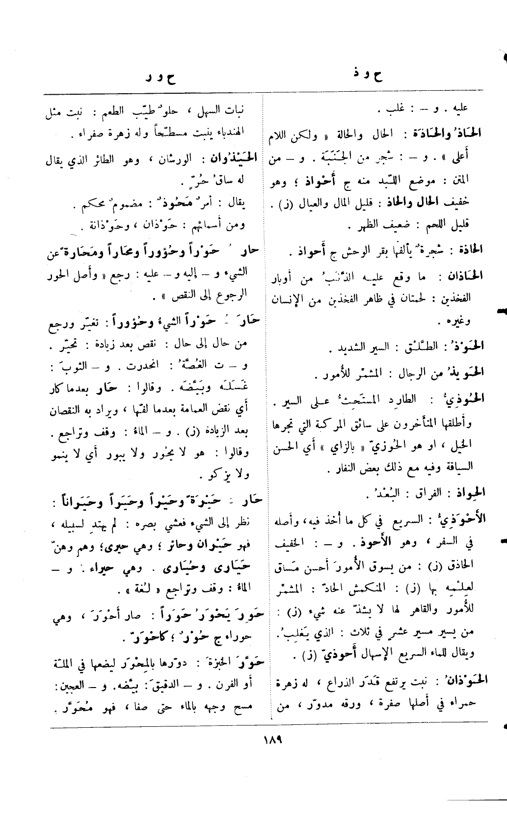 حار- حورًا الشيء وحؤورًا: تغير ورجع من حال إلى حال: نقص بعد زيادة: تحير. و- ت الغصة: انحدرت. و- الثوب: غسله وبيضه. وقالوا: حار بعدما كار أي نقض العمامة بعدما لفها، ويراد به النقصان بعد الزيادة (ز). و- الماء: وقف وتراجع. وقالوا: هو لا يحور ولا يبور أي لا ينمو ولا يزكو.