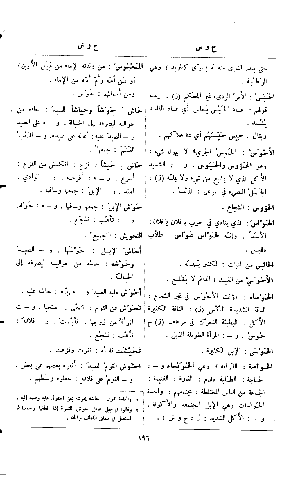 حاش- حوشًا وحياشًا الصيد: جاءه من حواليه ليصرفه إلى الحبالة. و- هـ على الصيد و- الصيد عليه: أعانه على صيده. و- الذئب الغنم: جمعها (¬1).