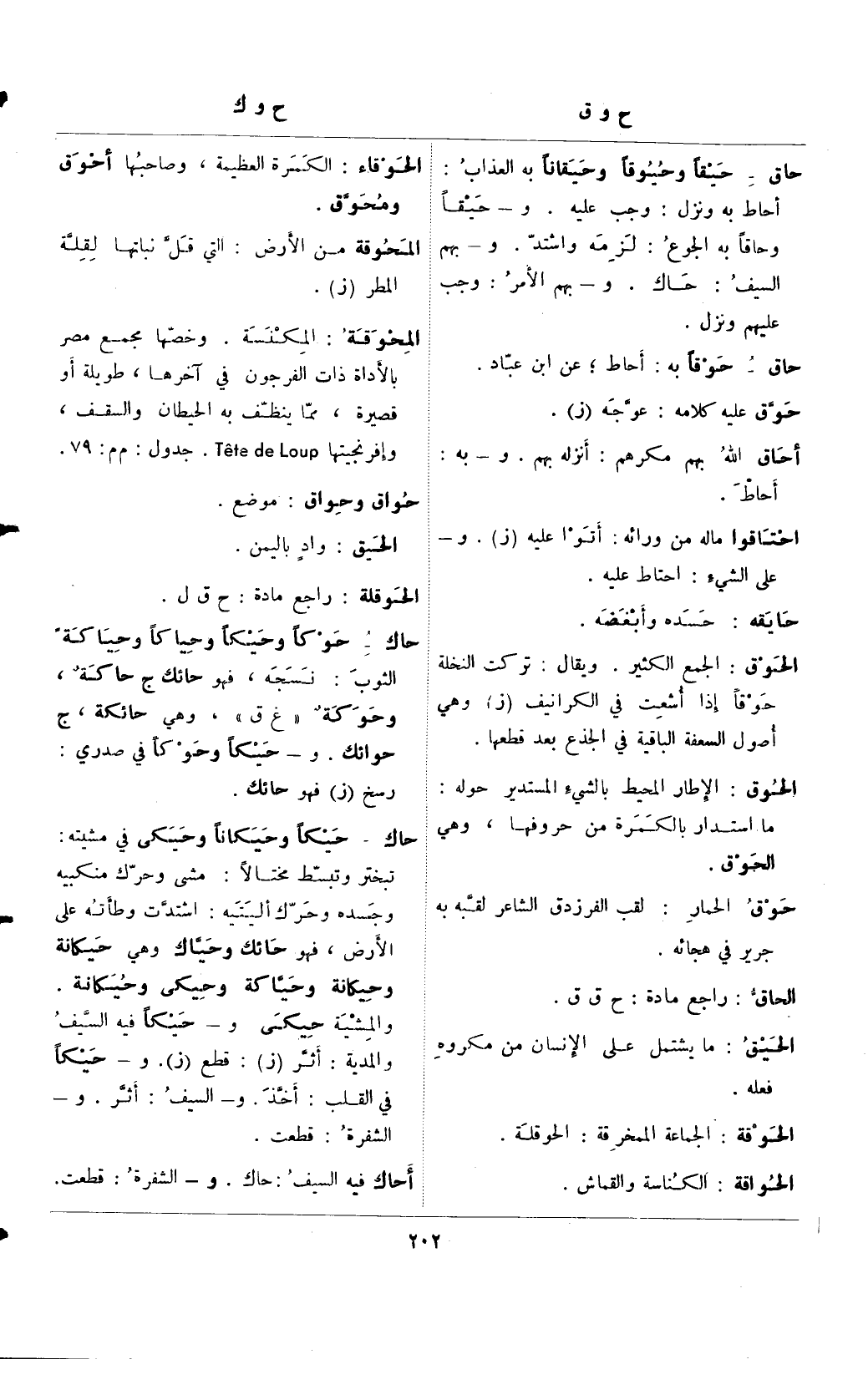حاق- حيقًا وحيوقًا وحيقانًا به العذاب: أحاط به ونزل: وجب عليه. و- حيقًا وحاقًا به الجوع: لزمه واشتد. و- بهم السيف: حاك. و- بهم الأمر: وجب عليهم ونزل.