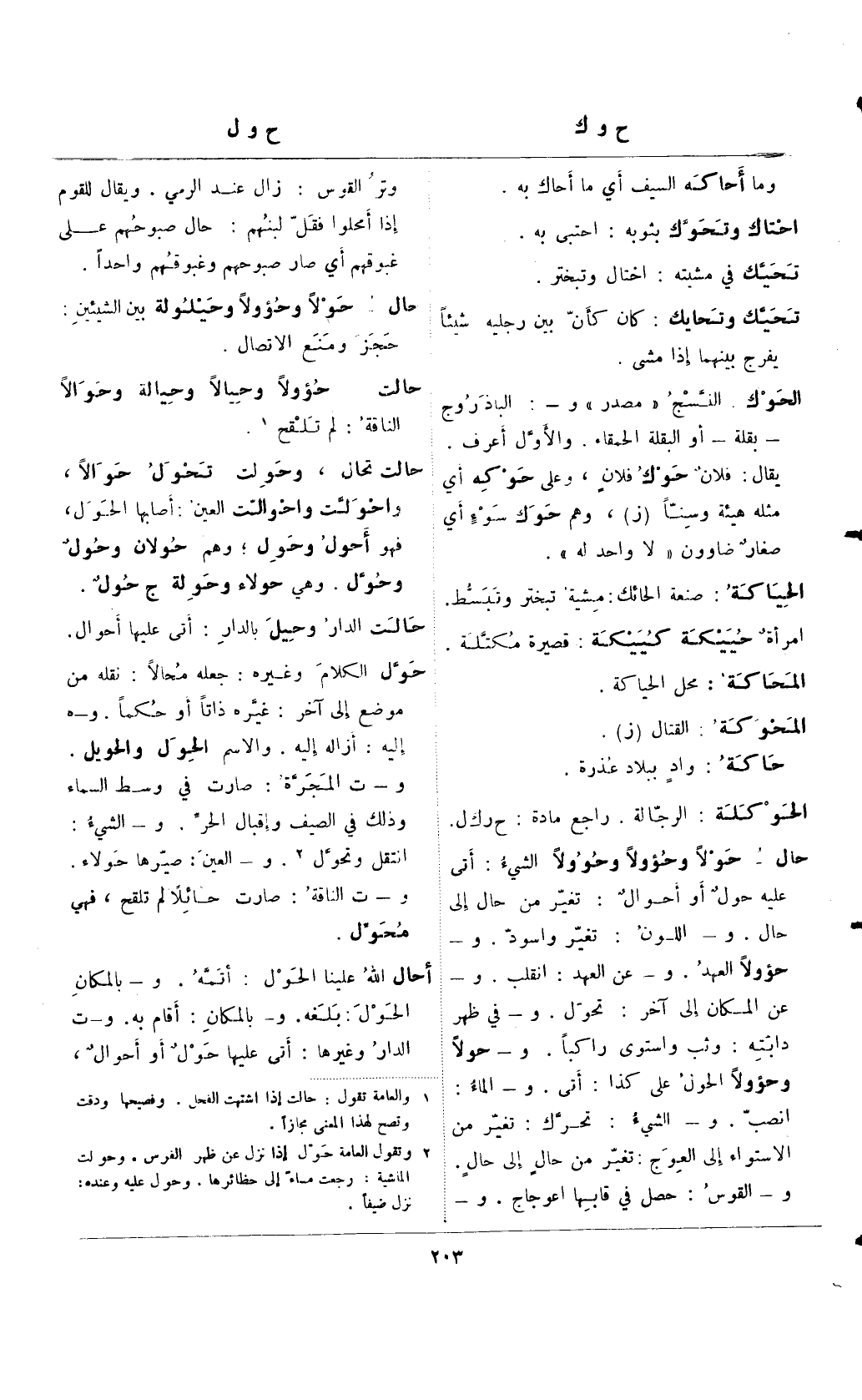 (¬2) () وتقول العامة حول إذا نزل عن ظهر الفرس. وحولت الماشية: رجعت ماءً إلى حظائرها. وحول عليه وعنده: نزل ضيفًا.