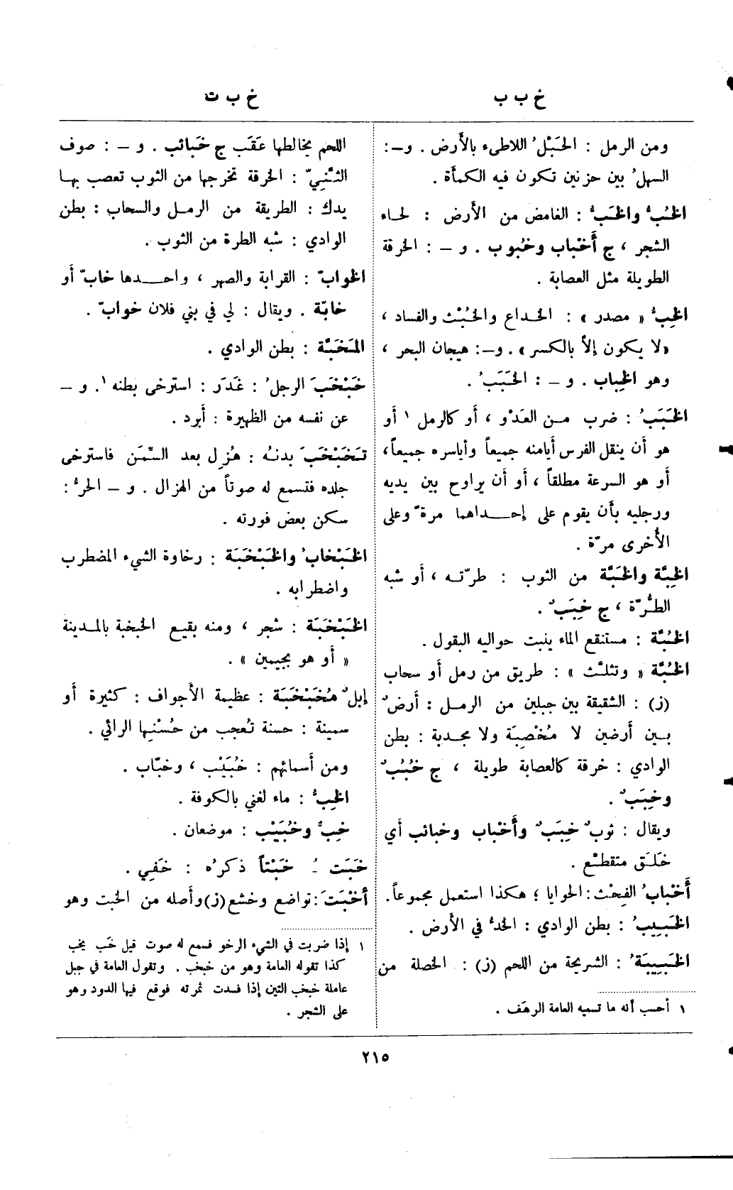 الخبة "وتثلث": طريق من رمل أو سحاب (ز): الشقيقة بين جبلين من الرمل: أرضٌ بين أرضين لا مخصبة ولا مجدبة: بطن الوادي: خرقة كالعصابة طويلة، ج خببٌ وخببٌ.