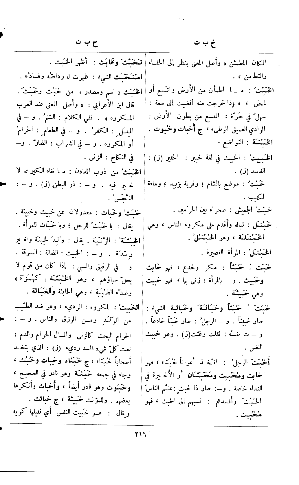 الخبث: المكروه: الرديء، وهو ضد الطيب من الولد ومن الرزق والناس. و-: الحرام البحث كالزنى والمال الحرام والدم: نعت كل شيءٍ فاسد رديء (ز): الذي يتخذ أصحابًا خبثاء، ج خبثاء وخبثات وخبث، وجاء في جمعه خبثة وهو نادر في الصحيح، وخبوث وهو نادر أيضًا، وأخباث وأنكرها بعضهم. وللمؤنث خبيثة، ج خبائث.