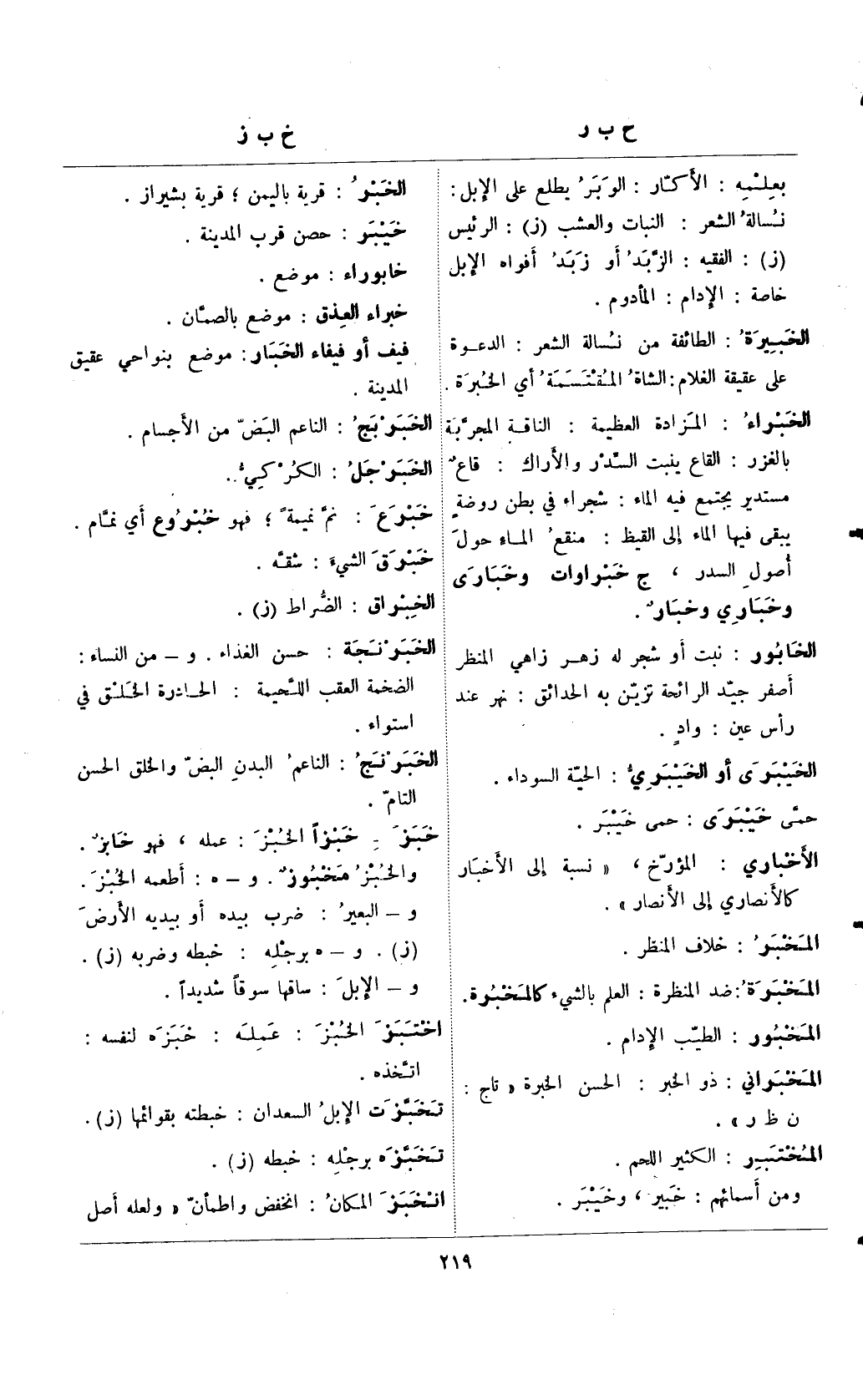 الخبراء: المزادة العظيمة: الناقة المجربة بالغزر: القاع ينبت السدر والأراك: قاعٌ مستدير يجتمع فيه الماء: شجراء في بطن روضةٍ يبقى فيها الماء إلى اليقظ: منقع الماء حول أصول السدر، ج خبراوات وخبارى وخباري وخبارٌ.