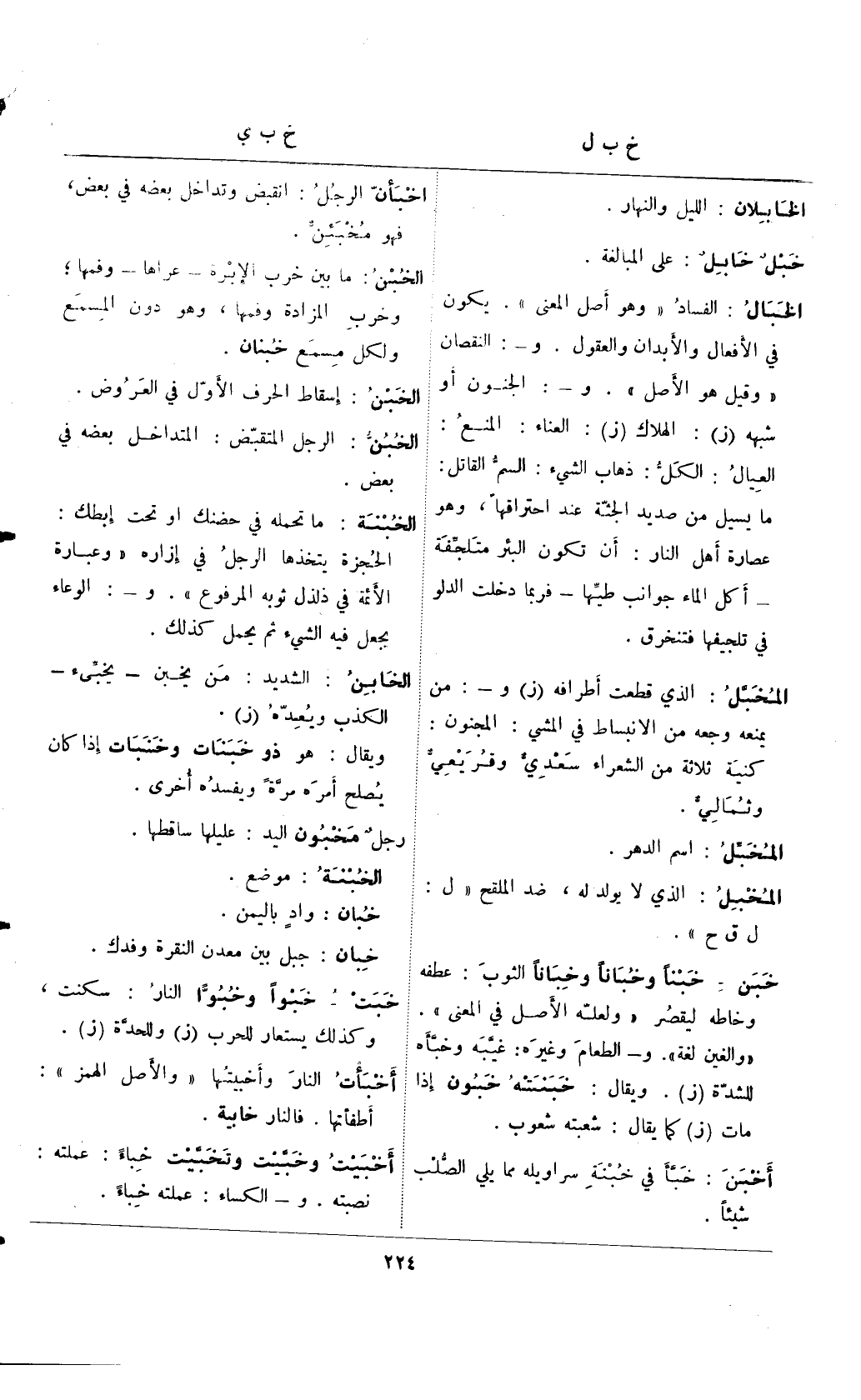 الخبال: الفساد "وهو أصل المعنى". يكون في الأفعال والأبدان والعقول. و-: النقصان "وقيل هو الأصل". و-: الجنون أو شبهه (ز): الهلاك (ز): العناء: المنع: العيال: الكل: ذهاب الشيء: السم القاتل: ما يسيل من صديد الجثة عند احتراقها، وهو عصارة أهل النار: أن تكون البئر متلجقة –أكل الماء جوانب طيها –فربنا دخلت الدلو في تجليفها فتنخرق.