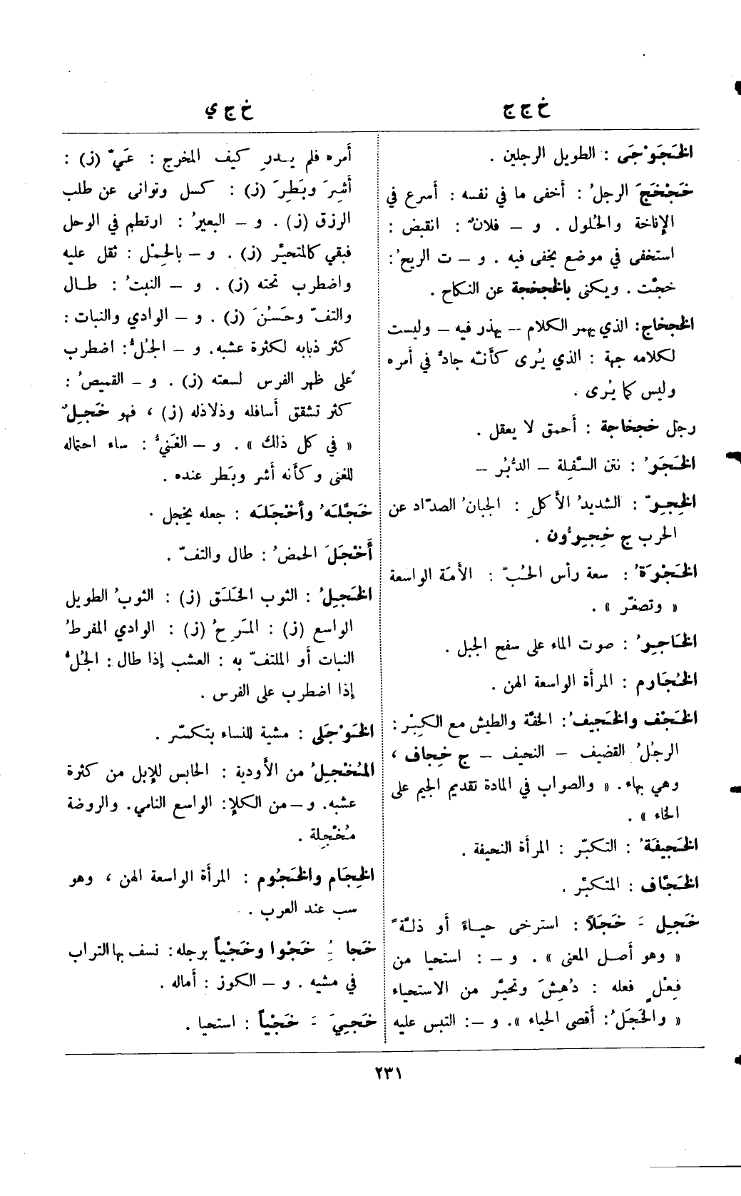 خجل- خجلًا: استرخى حياءً أو ذلةً "وهو أصل المعنى". و-: استحيا من فعلٍ فعله: دهش وتحير من الاستحياء "والخجل: أقصى الحياء". و-: التبس عليه