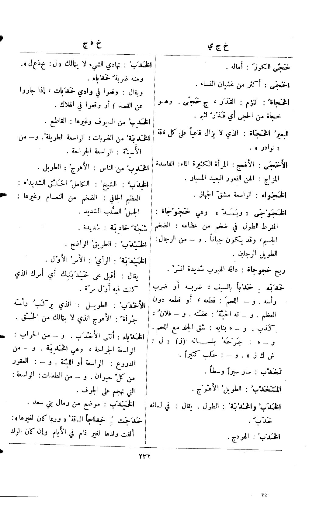 الخجوجى "ويمد" وهي خجوجاة: المفرط الطول في ضخم من عظامه: الضخم الجسيم، وقد يكون جبانًا. و- من الرجال: الطويل الرجلين.