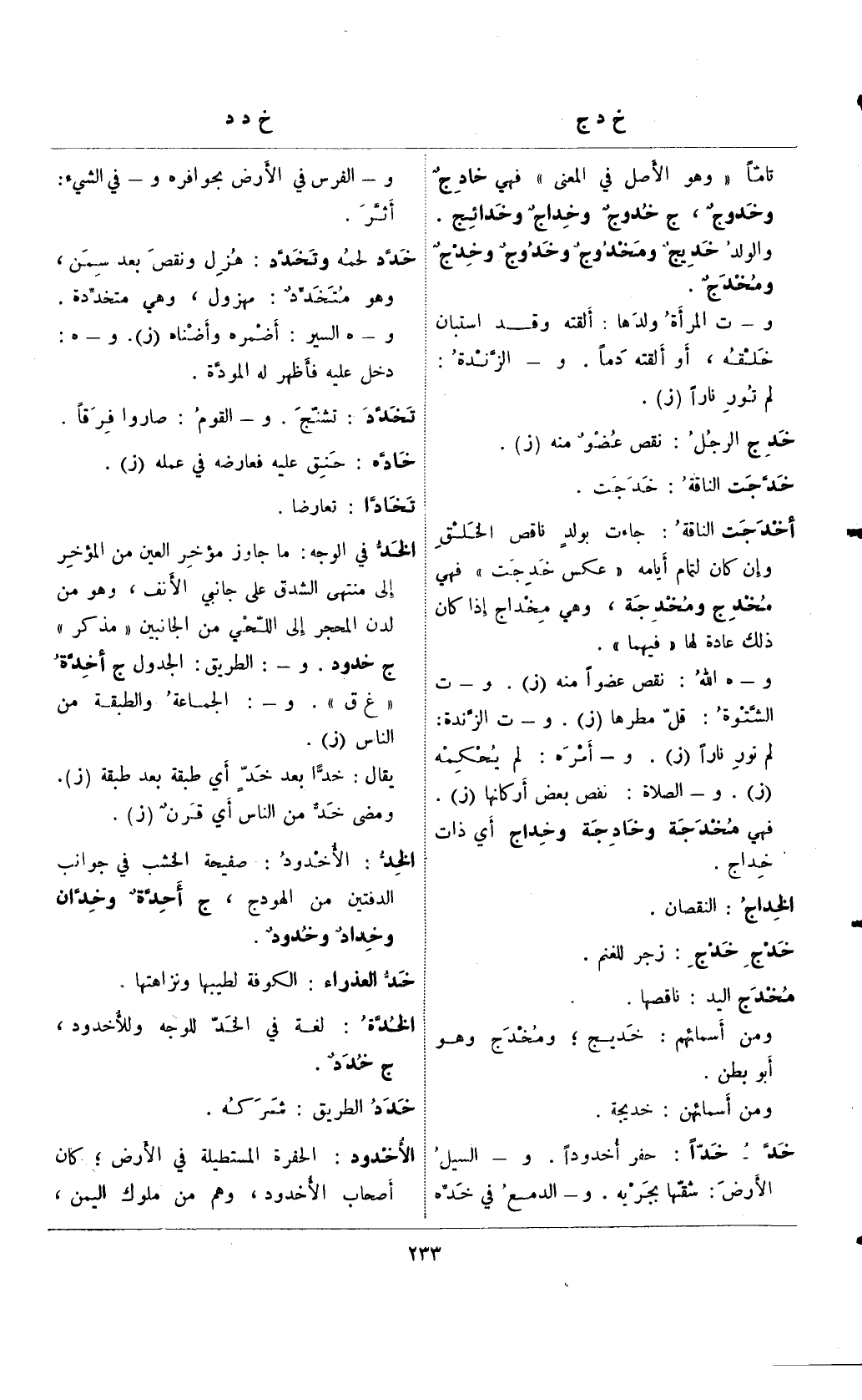 تامًا "وهو الأصل في المعنى: فهي خادجٌ وخدوجٌ، ج خدوجٌ وخداجٌ وخدائج. والولد خديجٌ ومخدوجٌ وخدوجٌ وخدجٌ ومخدجٌ.