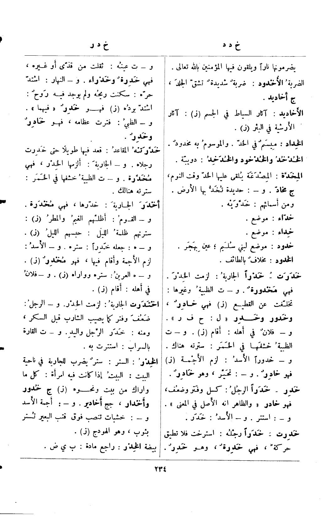 خدرت- خدرًا الجارية: لزمت الخدر. فهي مخدورةٌ. و- ت الظبية وغيرها: تخلفت عن القطيع (ز) فهي خادرٌ، وخدور وخدر "ل: ح ف ر". و- فلانٌ في أهله: أقام (ز). و- ت الظبية خشفها في الخمر: سترته هناك. و- خدورًا الأسد: لزم الأجمة (ز) فهو خادرٌ. و-: تحير، وهو خادرٌ.