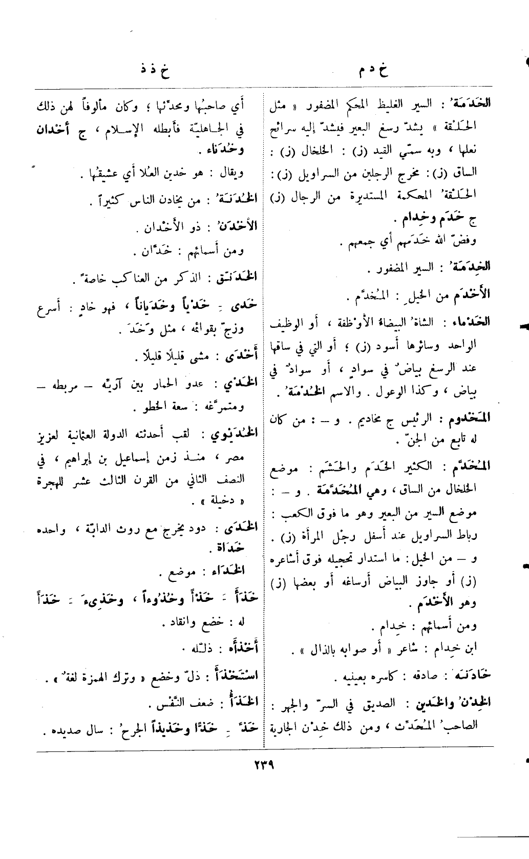 المخدم: الكثير الخدم والحشم: موضع الخلخال من الساق، وهي المخدمة. و-: موضع السير من البعير وهو ما فوق الكعب: رباط السراويل عند أسفل رجل المرأة (ز). و- من الخيل: ما استدار تحجيله فوق أشاعره (ز) أو جاوز البياض أرساغه أو بعضها (ز) وهو الأخدم.