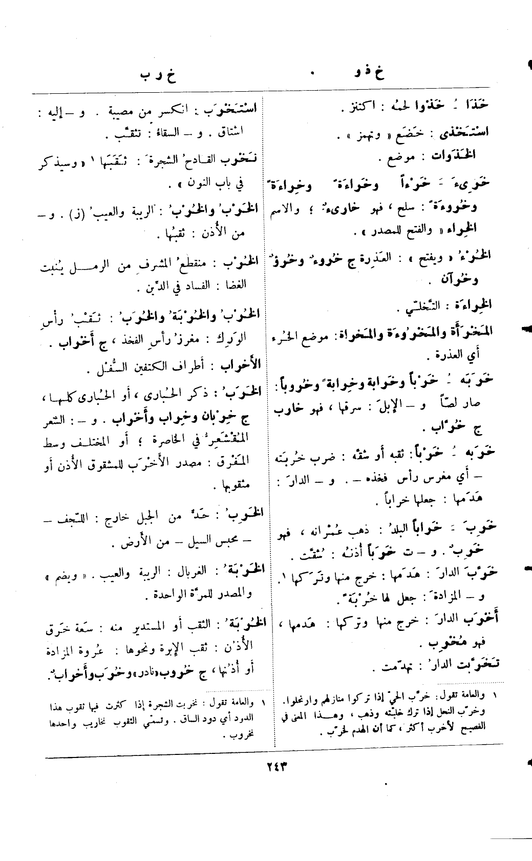 (¬1) () والعامة تقول: خرب الحي إذا تركوا منازلهم وارتحلوا. وخرب النحل إذا ترك خلبته وذهب، وهذا المعنى في الفصيح لأخبر أكثر، كما أن الهدم لخرب.