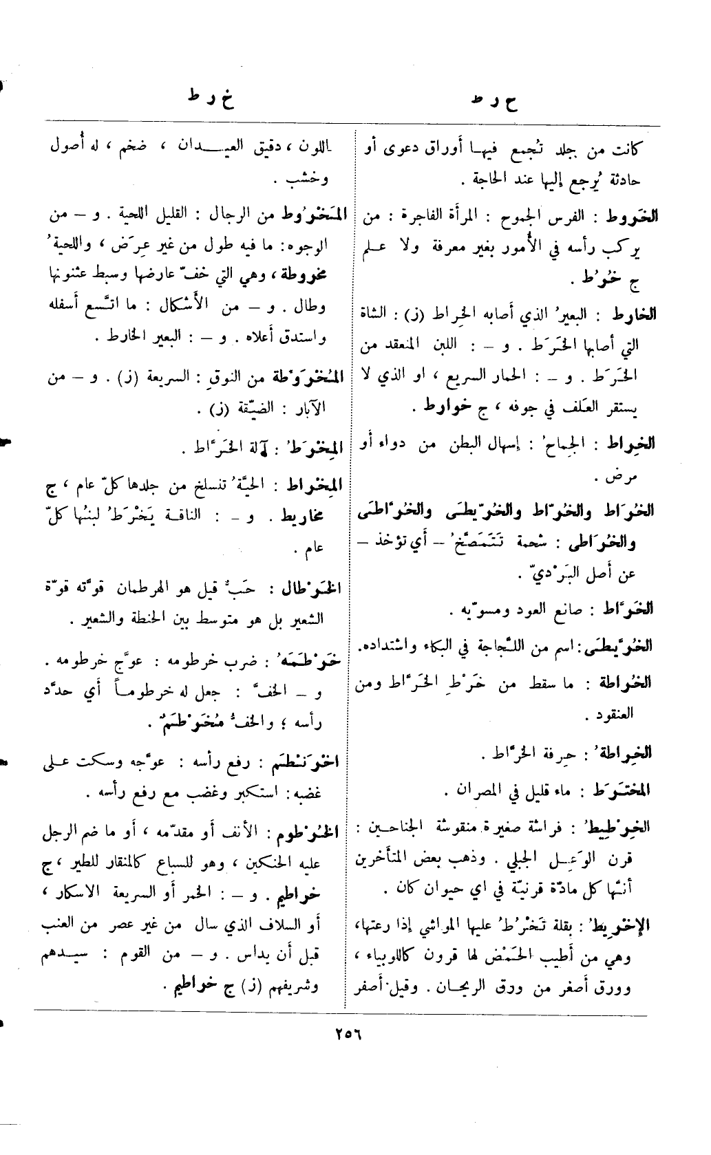الخروط: الفرس الجموح: المرأة الفاجرة: من يركب رأسه في الأمور بغير معرفة ولا علم ج خوط.