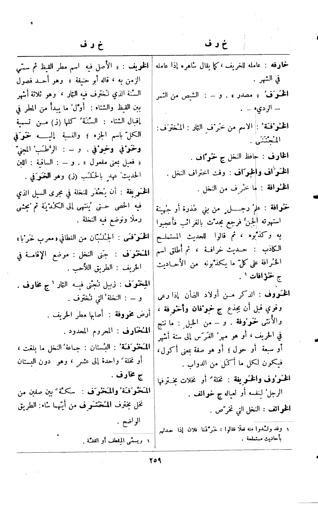 الخريف: "الأصل فيه اسم مطر القيظ ثم سمي الزمن به، قال أبو حنيفة" وهو أحد فصول السنة التي تخترف فيه الثمار، وهو ثلاثة أشهر بين القيظ والشتاء: أول ما يبدأ من المطر في إقبال الشتاء: السنة كلها (ز) من تسمية الكل باسم الجزء؛ والنسبة إليه خرفي وخرفي وخرفي. و-: الرطب المجني "فعيل بمعنى مفعول". و-: الساقية: اللبن الحديث عهدٍ بالحلب (ز) وهو الخرفي.