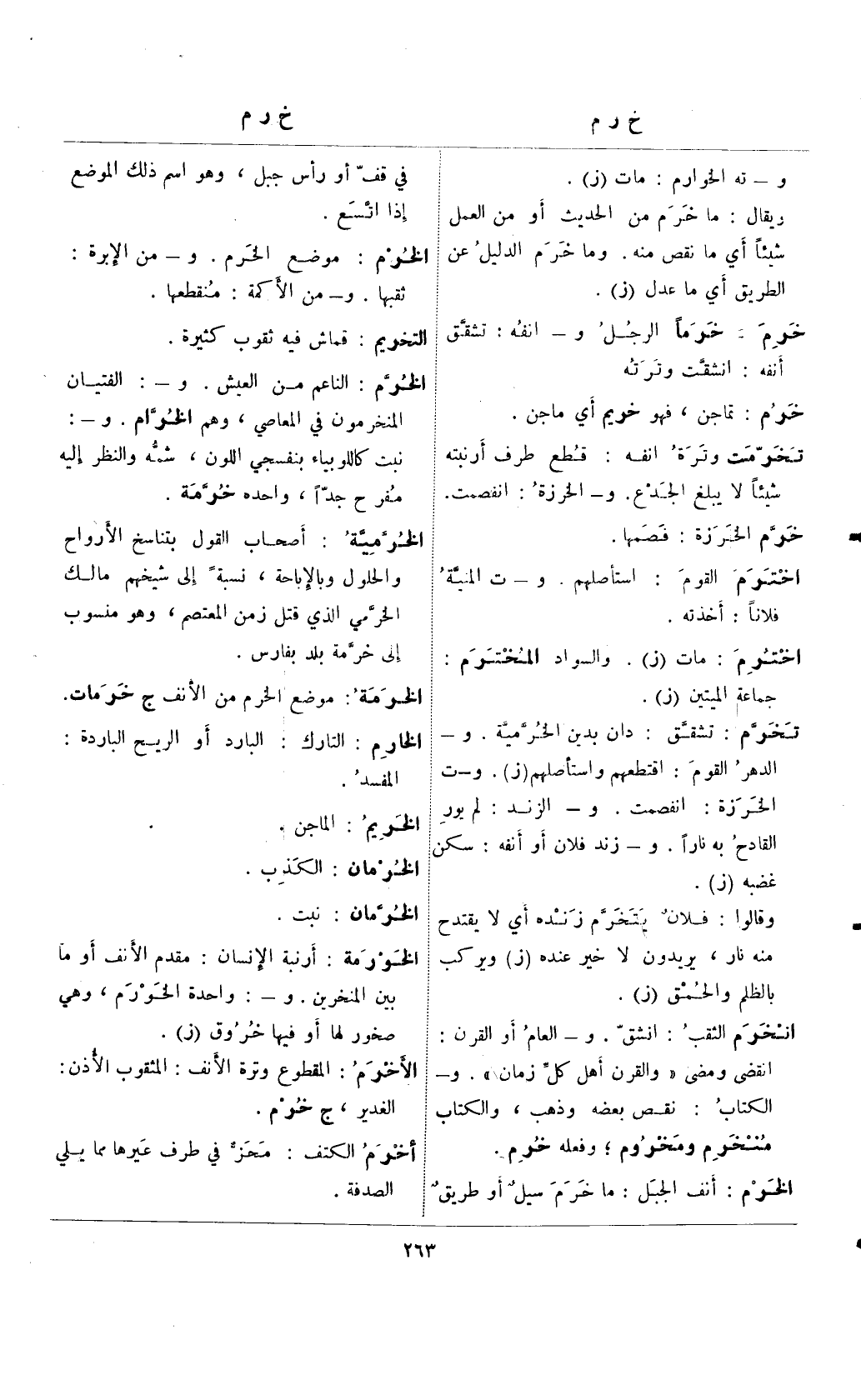 تخرم: تشقق: دان بدين الخرمية. و- الدهر القوم: اقتطعهم واستأصلهم (ز). و- ت الخرزة: انفصمت. و- الزند: لم يور القادح به نارًا. و- زند فلان أو أنفه: سكن غضبه (ز).