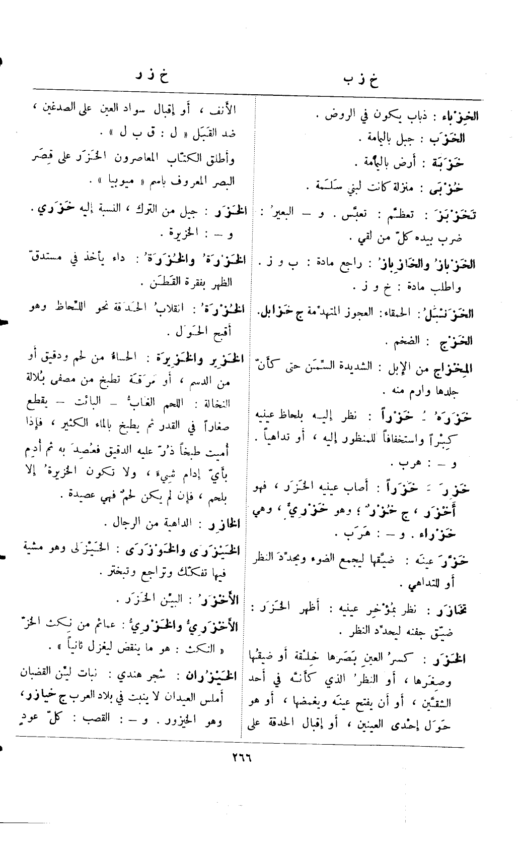 خزر- خزرًا: أصاب عينيه الخزر، فهو أخزر، ج خزرٌ؛ وهو خزري، وهي خزراء. و-: هرب.