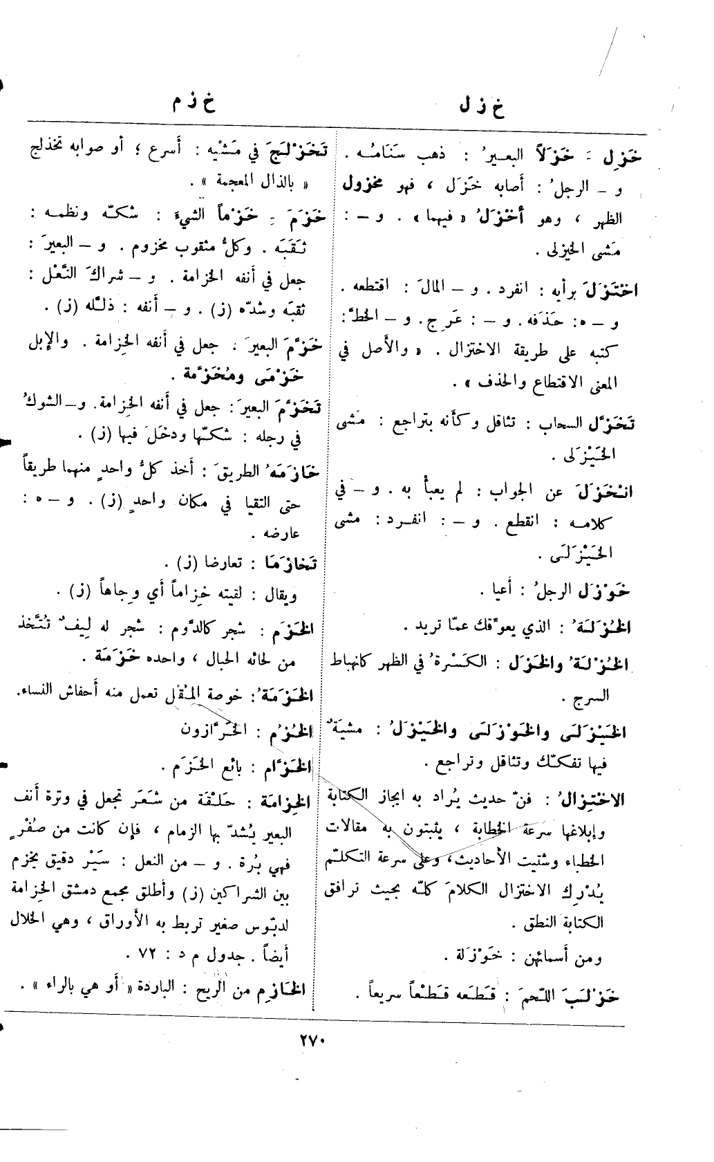 خزل- خزلًا البعير: ذهب سنامه. و- الرجل: أصابه خزل، فهو مخزول الظهر، وهو أخزل "فيهما". و-: مشى الخيزلى.