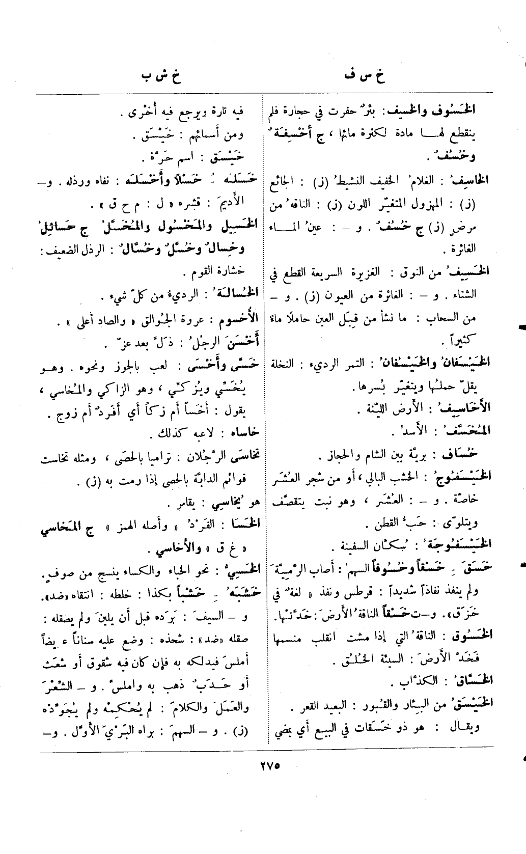 الخسيف من النوق: الغزيرة السريعة القطع في الشتاء. و-: الغائرة من العيون (ز). و- من السحاب: ما نشأ من قبل العين حاملًا ماءً كثيرًا.