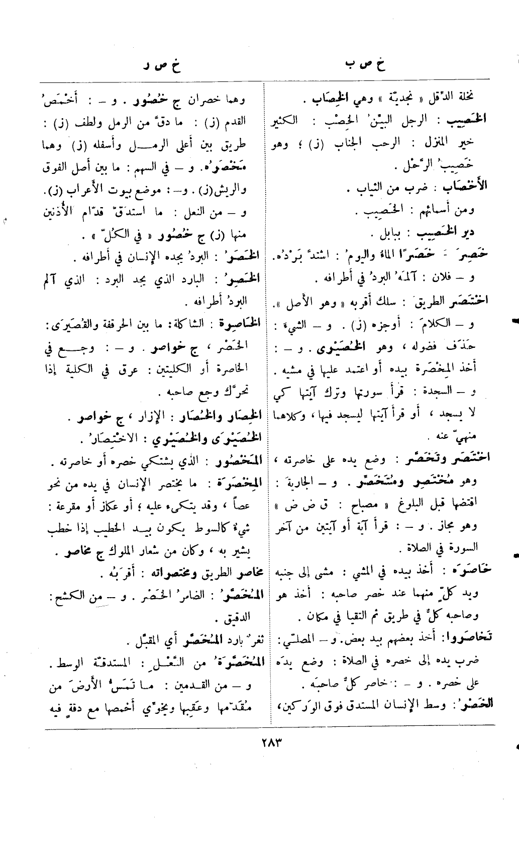 وهما خصران ج خصور. و-: أخمص القدم (ز): ما دق من الرمل ولطف (ز): طريق بين أعلى الرمل وأسفله (ز) وهما مخصره. و- في السهم: ما بين أصل الفوق والريش (ز). و-: موضع بيوت الأعراب (ز). و- من النعل: ما استدق قدام الأذنين منها (ز) ج خصور "في الكل".