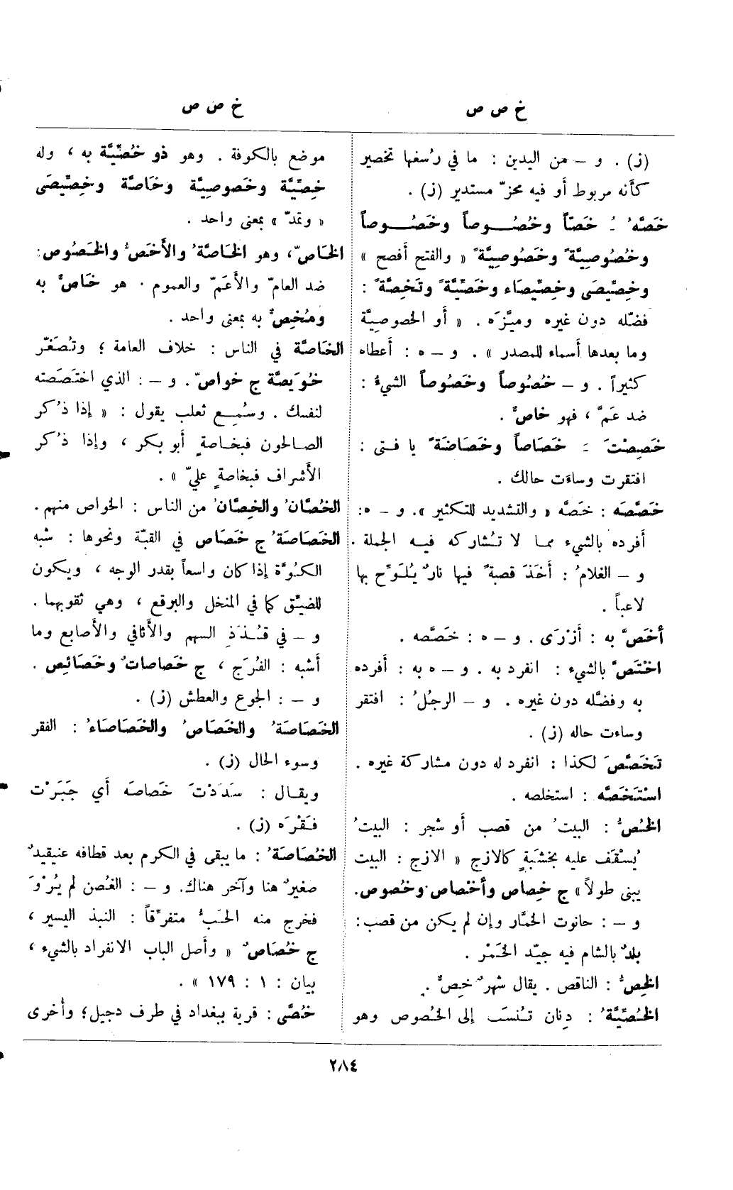 الخاصة في الناس: خلاف العامة؛ وتصغر خويصة ج خواص. و-: الذي اختصصته لنفسك. وسمع ثعلب يقول: "إذا ذكر الصالحون فبخاصةٍ أبو بكر، وإذا ذكر الأشراف فبخاصةٍ على".