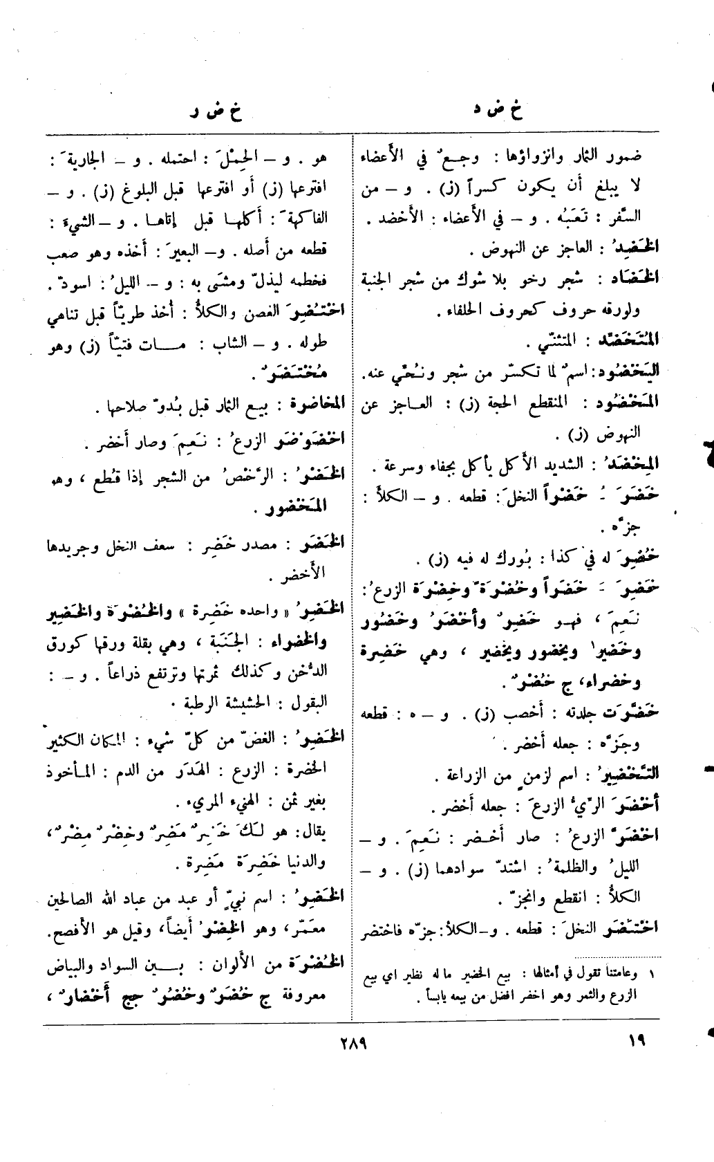الخضر: الغض من كل شيء: المكان الكثير الخضرة: الزرع: الهدر من الدم: المأخوذ بغير ثمن: الهنيء المريء.