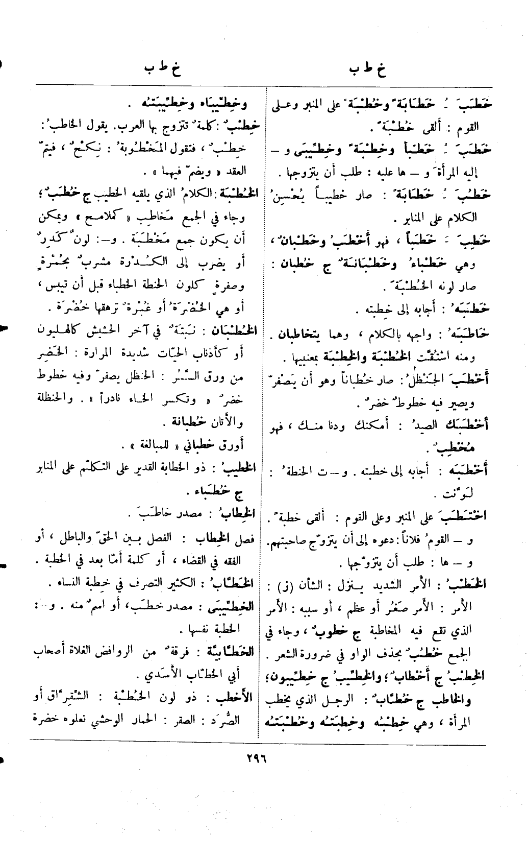 الخطبة: الكلام الذي يلقيه الخطيب ج خطيبٌ؛ وجاء في الجمع مخاطب "كملامح" ويمكن أن يكون جمع مخطبة. و-: لونٌ كدرٌ أو يضرب إلى الكدرة مشربٌ بحمرةٍ وصفرةٍ كلون الحنطة الخطباء قبل أن تيبس، أو هي الخضرة أو غبرةٌ ترهقها خضرة.
