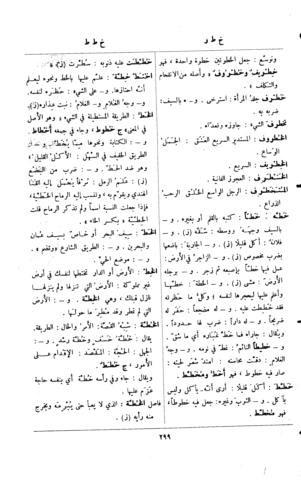 الخط: الطريقة المستطيلة في الشيء "وهو الأصل في المعنى" ج خطوط، وجاء في جمعه أخطاط. و-: الكتابة ونحوها مما يخط. و-: الطريق الخفيف في السهل: الأكل القليل، وهو ضد الحط. و-: ضرب مكن البضع (ز): علم الرمل: مرفأ يحمل إليه القنا الهندي ويقوم به، وتنسب إليه الرماح الخطية، فإذا جعلت النسبة اسمًا ولم تذكر الرماح قلت الخطية "بكسر الخاء".