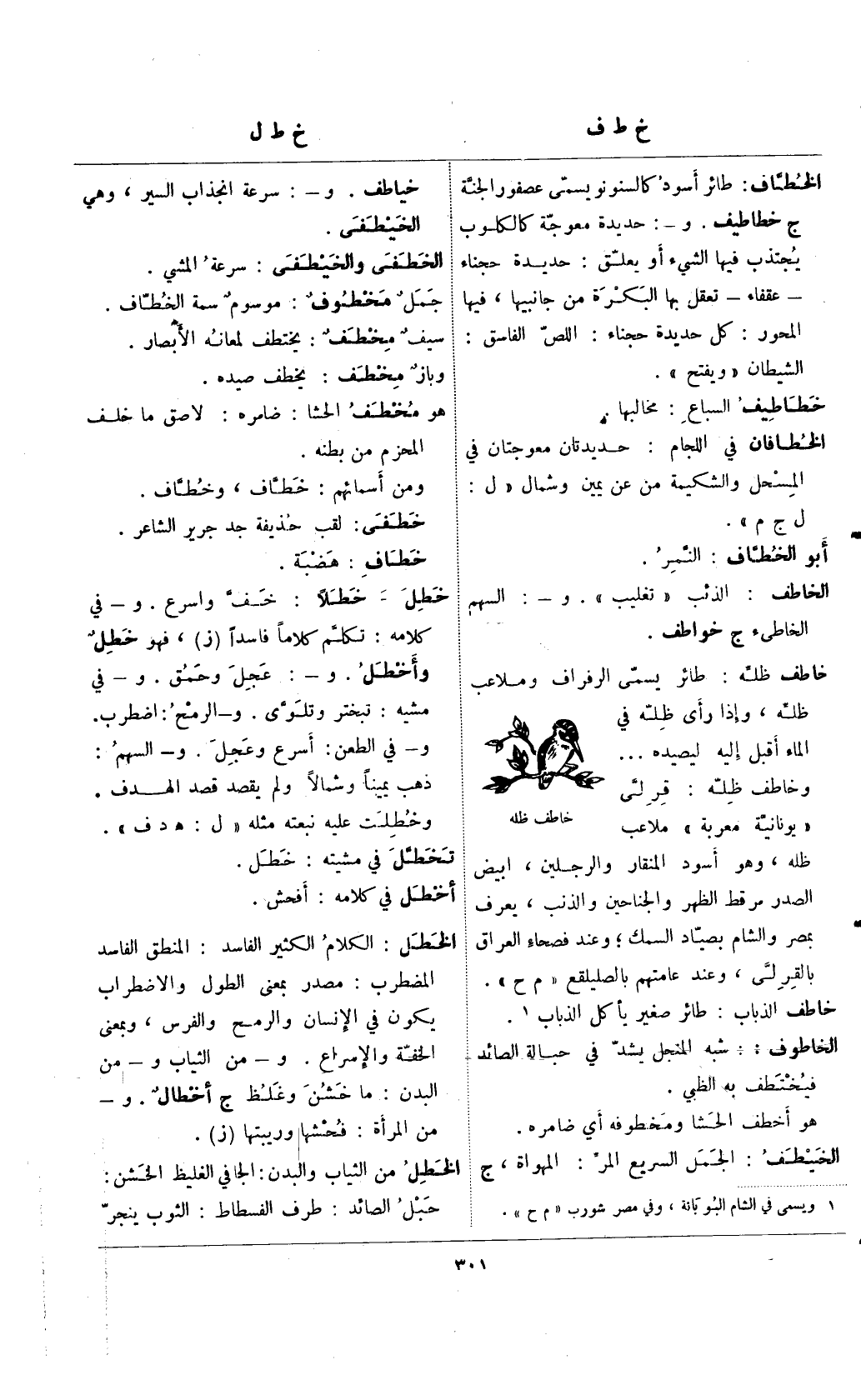 الخطاف: طائر أسود كالسنونو يمسى عصفور الجنة ج خطاطيف. و-: حديدة معوجة كالكلوب يجتذب فيها الشيء أو يعلق: حديدة حجناء –عقفاء –تعقل بها البكرة من جانبيها، فيها المحور: كل حديدة حجناء: اللص الفاسق: الشيطان "ويفتح".