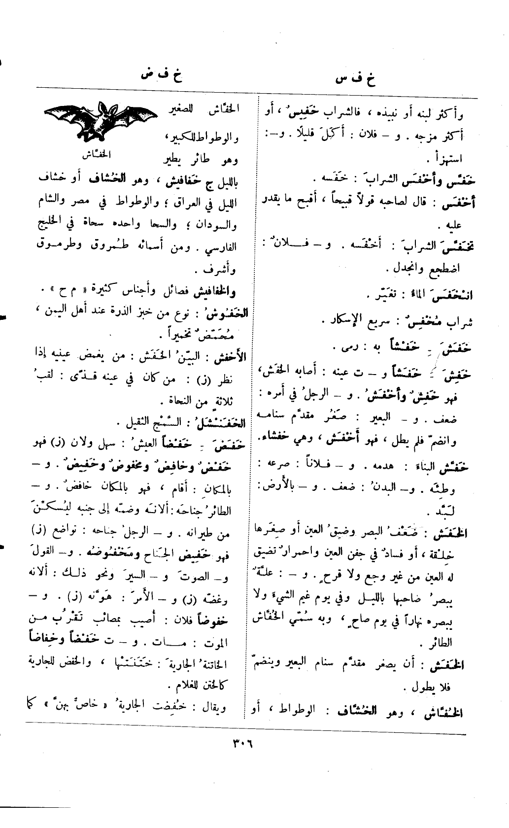 الخفاش الصغير والوطواط للكبير، وهو طائر يطير بالليل ج خفافيش، وهو الخشاف أو خشاف الليل في العراق؛ والوطواط في مصر والشام والسودان؛ والسحا واحده سحاة في الخليج الفارسي. ومن أسمائه طمروق وطرموق وأشرف.