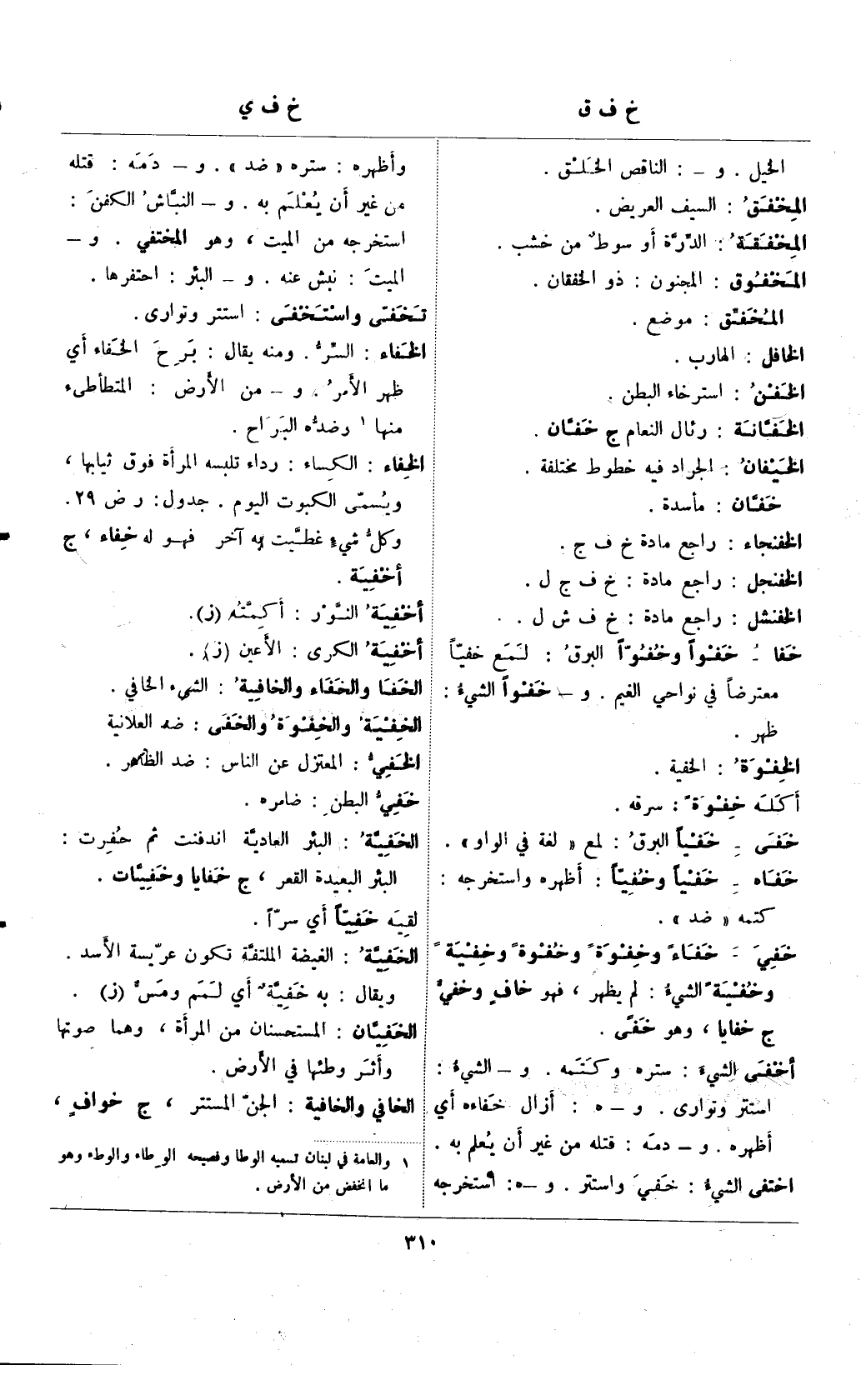 خفي- خفاءً وخفوةً وخفوةً وخفيةً وخفيةً الشيء: لم يظهر، فهو خافٍ وخفي ج خفايا، وهو خفًى.