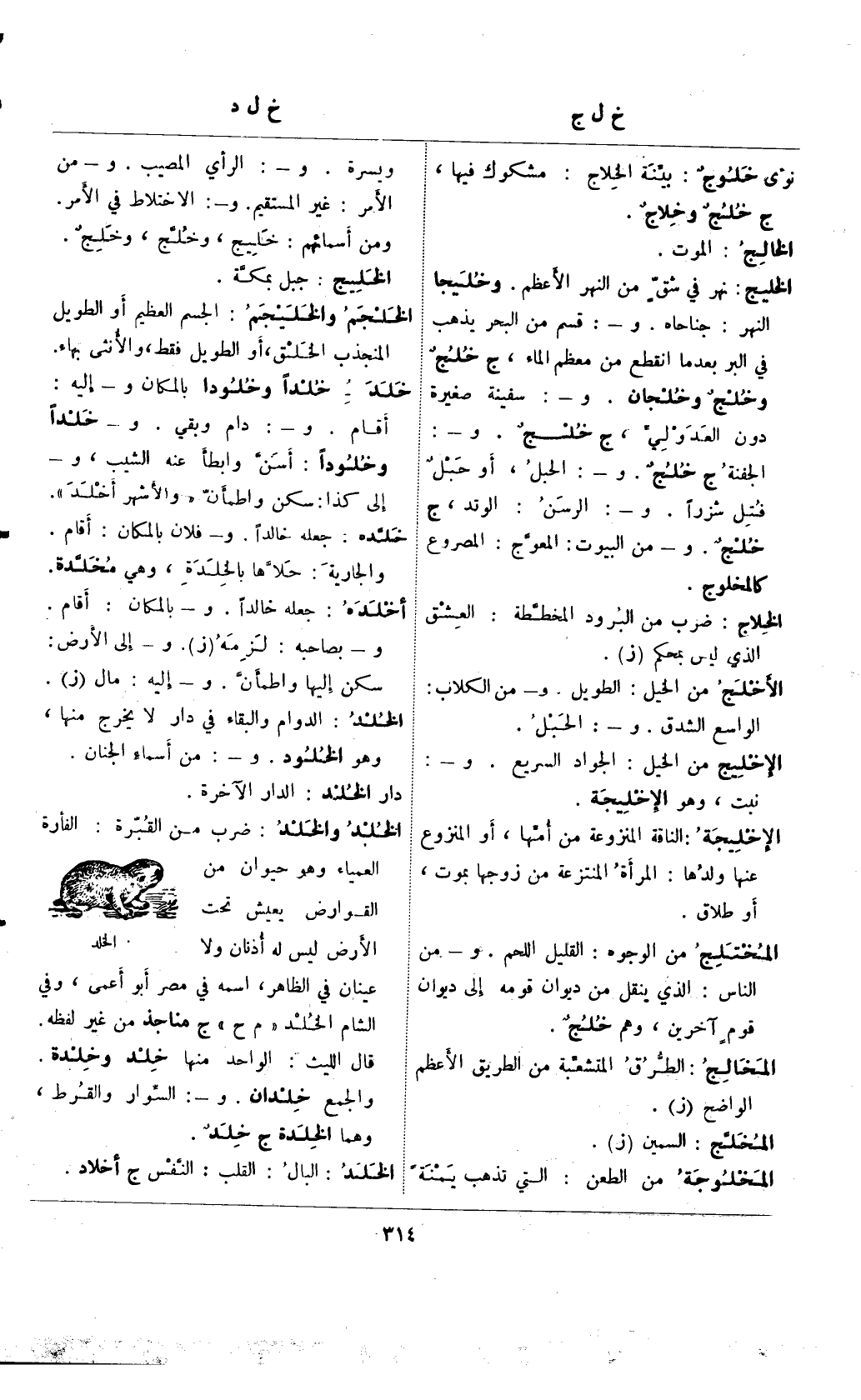 الخلد والخلد: ضرب من القبرة: الفأرة العمياء وهو حيوان من القوارض يعيش تحت الأرض ليس له أذنان ولا عينان في الظاهر، اسمه في مصر أبو أعمى، وفي الشام الخلد "م ح" ج مناجذ من غير لفظه. قال الليث: الواحد منه خلد وخلدة. والجمع خلدان. و-: السوار والقرط، وهما الخلدة ج خلدٌ.