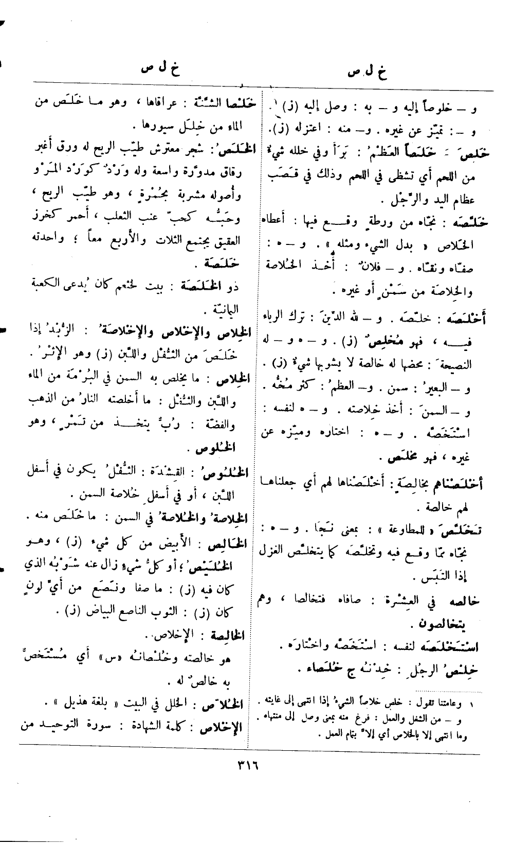 (¬1) () وعامتنا تقول: خلص خلاصًا الشيء إذا انتهى إلى غايته. و- من الشغل والعمل: فرغ منه بمعنى وصل إلى منتها. وما انتهى إلا بالخلاص أي إلا بتمام العمل.