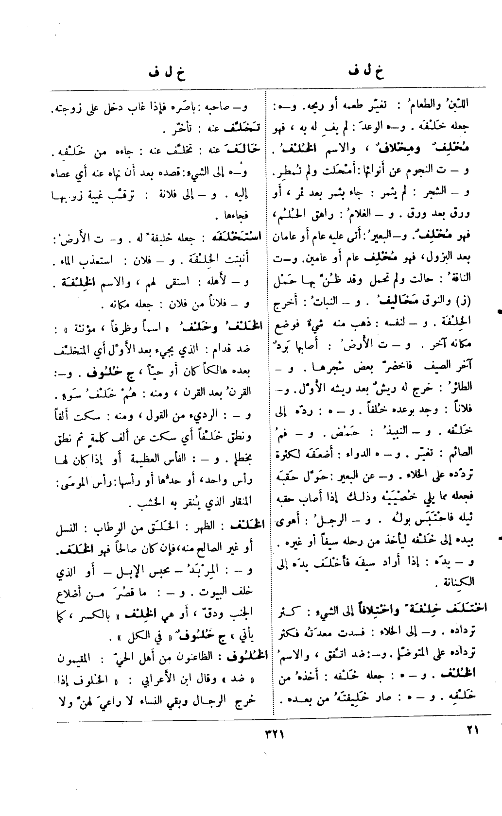 اختلف خلفةً واختلافًا إلى الشيء: كثر ترداده. و- إلى الخلاء: فسدت معدته فكثر ترداده على المتوضإ. و-: ضد اتفق، والاسم الخلف. و- هـ: جعله خلفه: أخذه من خلفه. و- هـ: صار خليفته من بعده.