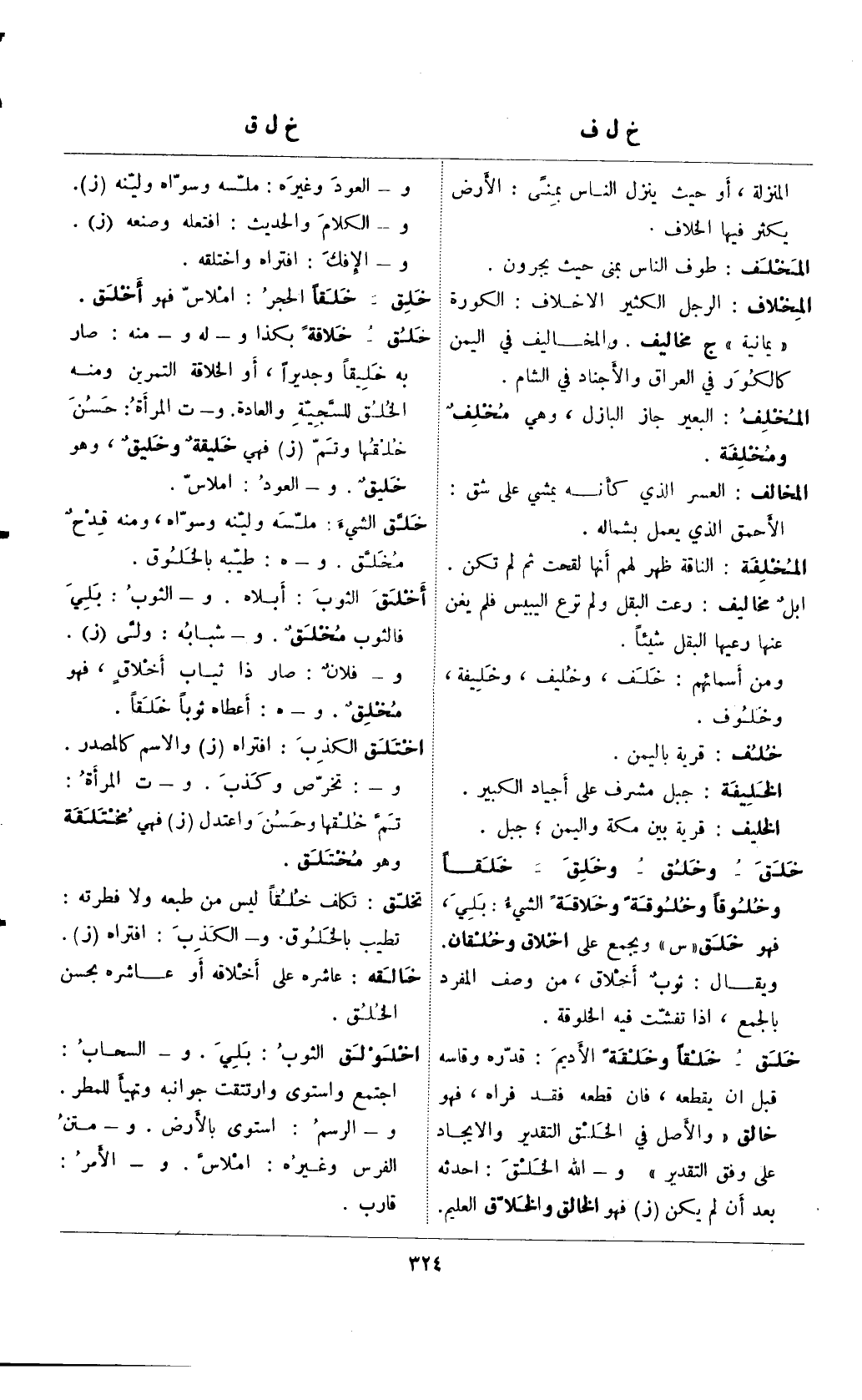 خلق- خلقًا وخلقةً الأديم: قدره وقاسه قبل أن يقطعه، فإن قطعه فقد فراه، فهو خالق "والأصل في الخلق التقدير والإيجاد على وفق التقدير" و- الله الخلق: احدثه بعد أن لم يكن (ز) فهو الخالق والخلاق العليم.