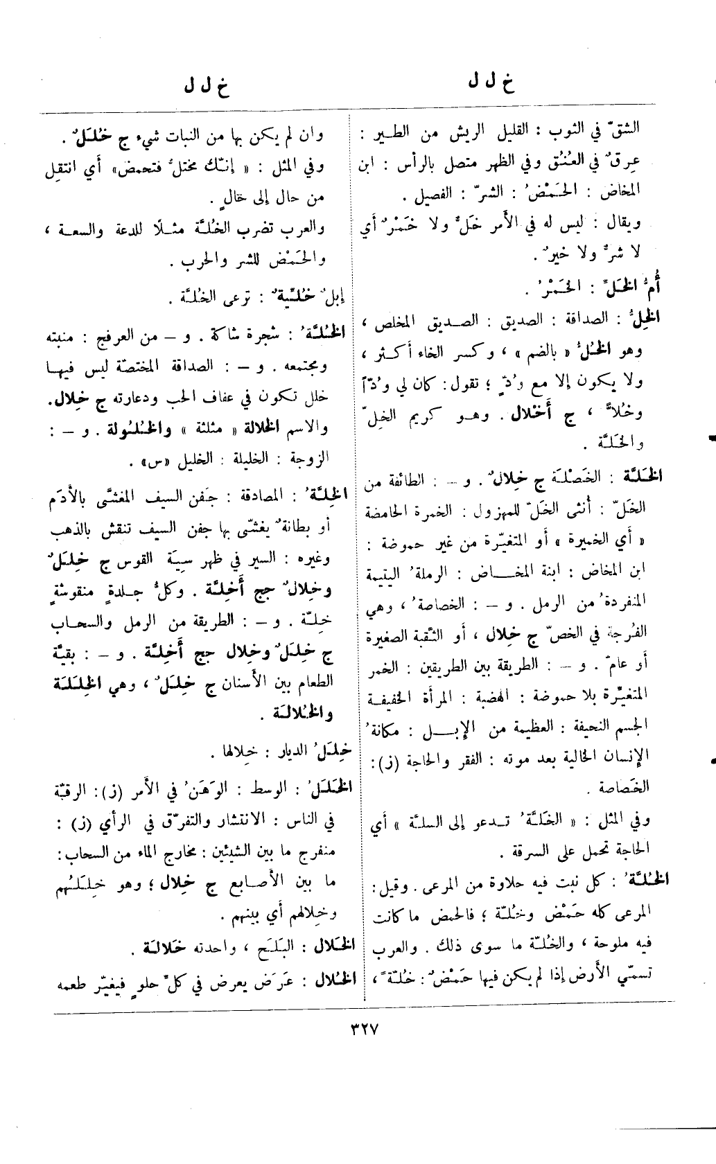 الخل: الصداقة: الصديق: الصديق المخلص، وهو الخل "بالضم"، وكسر الخاء أكثر، ولا يكون إلا مع ودٍ؛ تقول: كان لي ودًا وخلًا، ج أخلال. وهو كريم الخل والخلة.