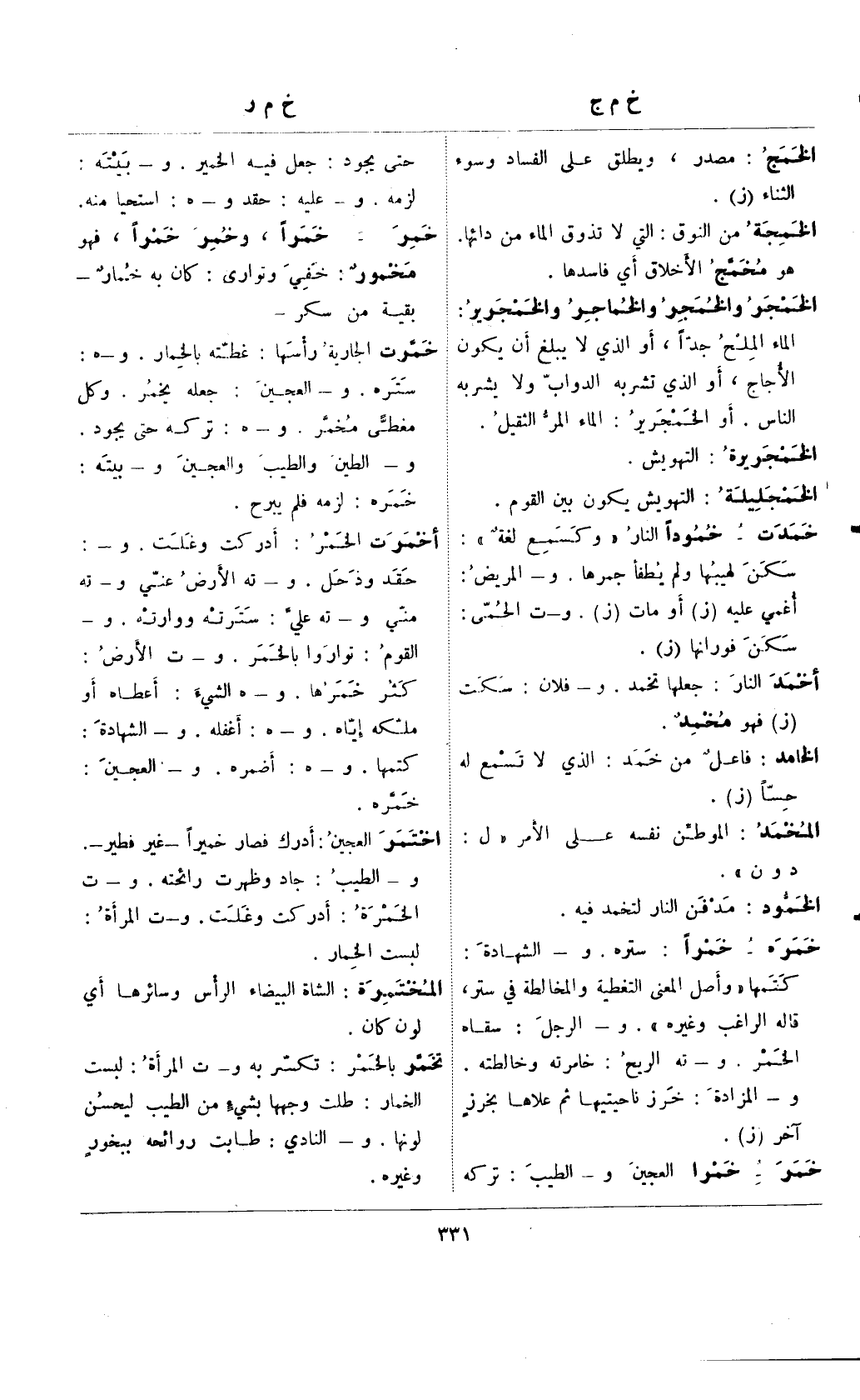خمره- خمرًا: ستره. و- الشهادة: كتمها "وأصل المعنى التغطية والمخالطة في ستر، قاله الراغب وغيره". و- الرجل: سقاه الخمر. و- ته الريح: خامرته وخالطته. و- المزادة: خرز ناحيتيها ثم علاها بخرزٍ آخر (ز).