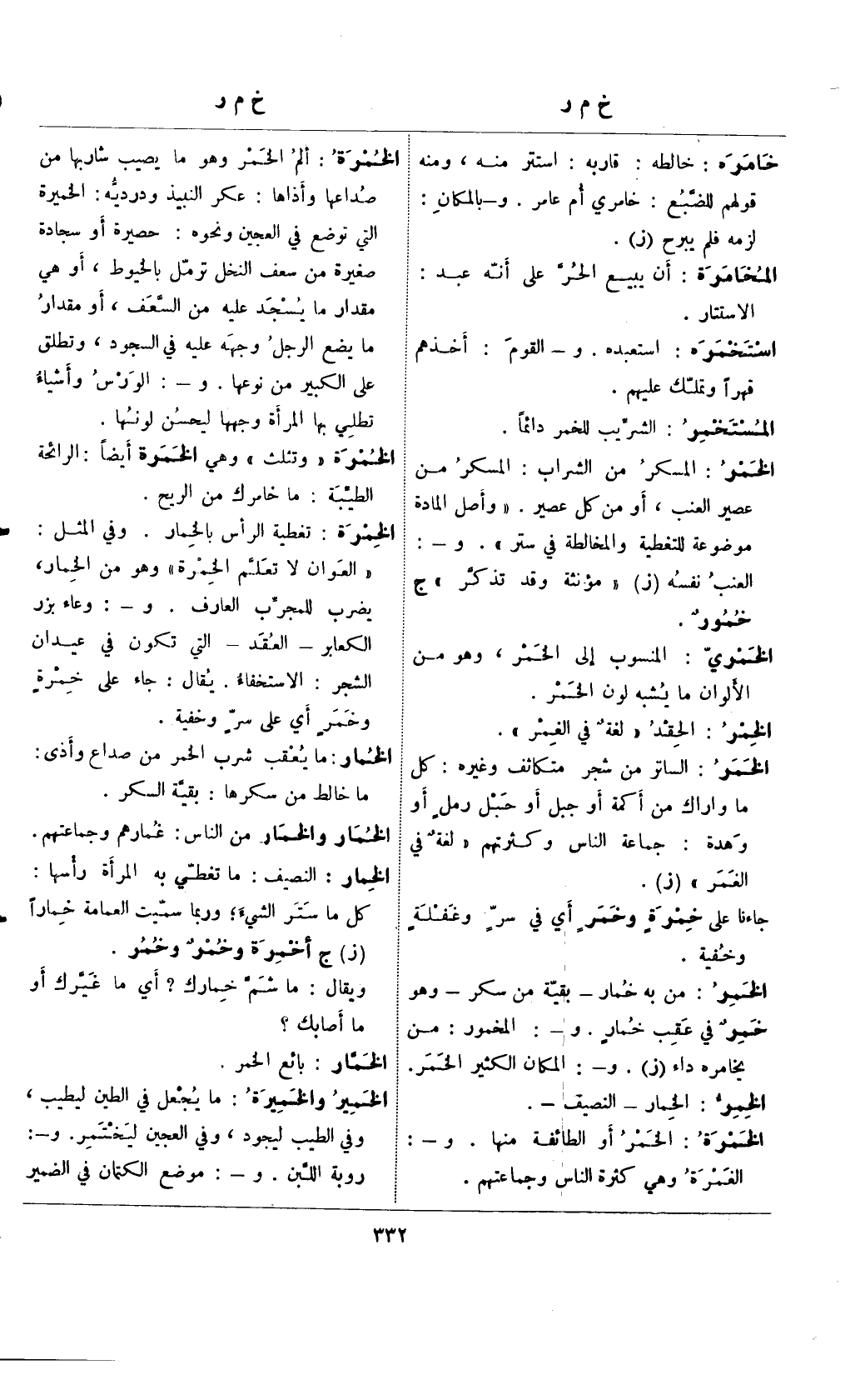 الخمر: المسكر من الشراب: المسكر من عصير العنب، أو من كل عصير. "وأصل المادة موضوعة للتغطية والمخالطة في ستر". و-: العنب نفسه (ز) "مؤنثة وقد تذكر" ج خمورٌ.
