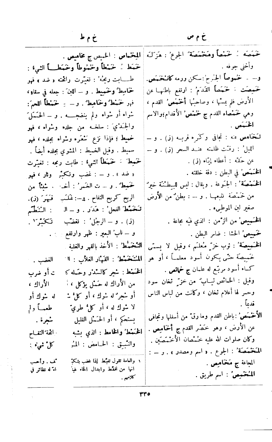 خمصت- خمصًا القدم: ارتفع باطنها عن الأرض فلم يمسها، وصاحبها أخمص القدم، وهي خمصاء القدم ج خمص الأقدام؛ والاسم الخمص.