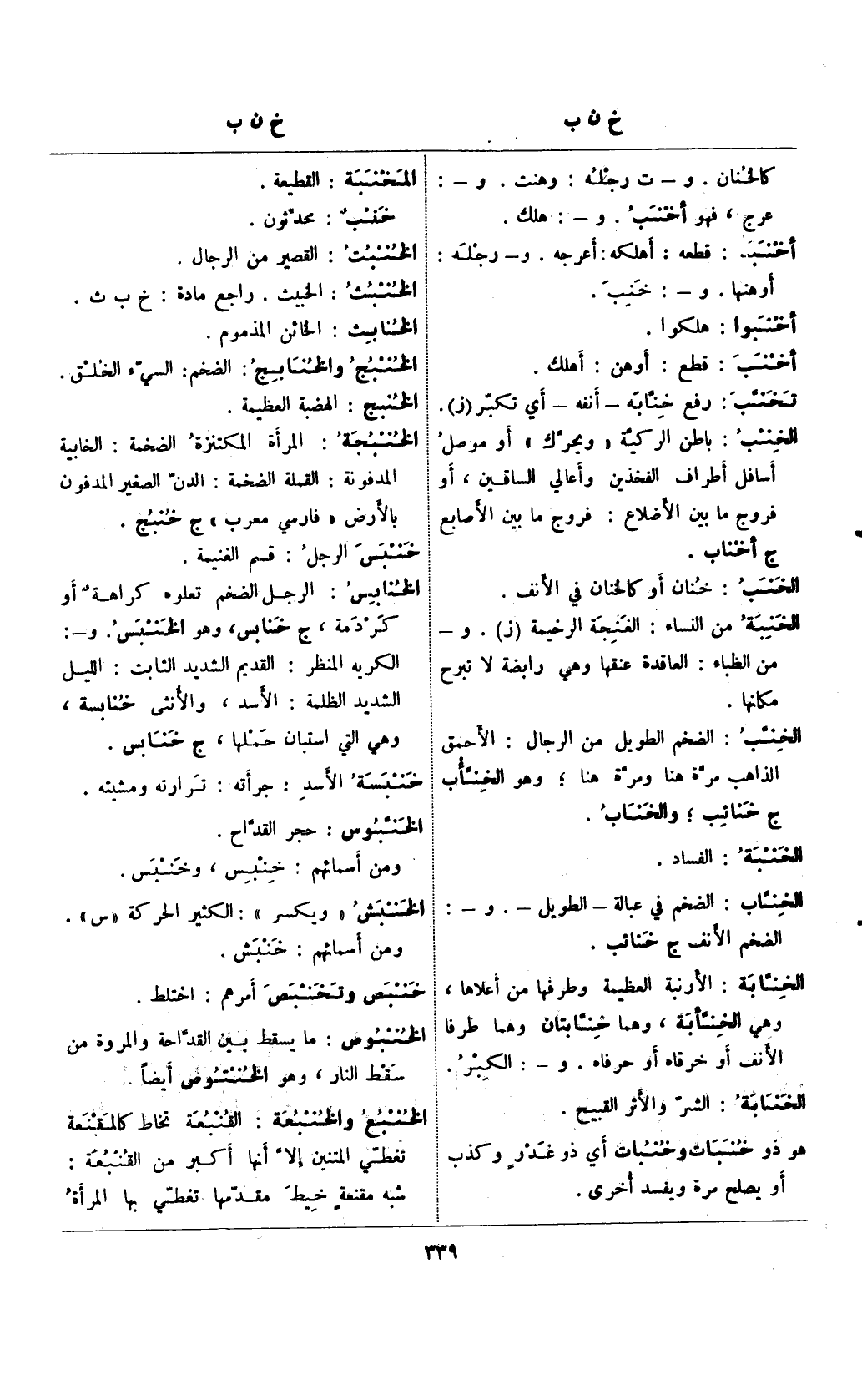 الخنابس: الرجل الضخم تعلوه كراهةٌ أو كردمة، ج خنابس، وهو الخنبس. و-: الكريه المنظر: القديم الشديد الثابت: الليل الشديد الظلمة: الأسد، والأنثى خنابسة، وهي التي استبان حملها، ج خنابس.