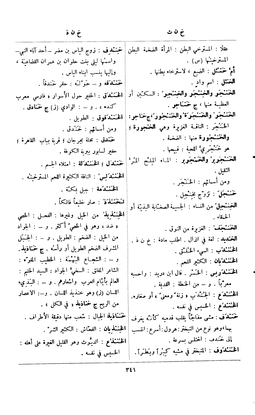 الخنذيذ من الخيل وغيرها: الفحل: الخصي "ضد" وهو في الخصي أكثر. و-: الجواد من الخيل: الضخم: الطويل: و-: الجبل المشرف الضخم الطويل أو رأسه. ج خناذيذ. و-: الشجاع البهمة: الخطيب المفوه: الشاعر المفلق: السخي الجواد: السيد الحليم: العالم بأيام العرب واشعارهم. و-: البذيء اللسان (ز) وهو خنذيذ اللسان. و-: الإعصار من الريح ج خناذيذ "في الكل".