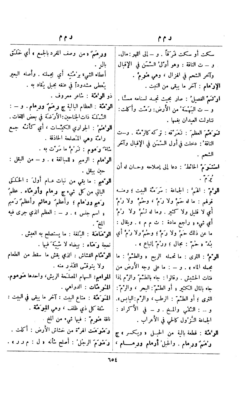الرم: الثرى: ما تحمله الريح "والطم: ما يحمله الماء". و-: ما على وجه الأرض من فتات الحشيش. وقالوا: جاء بالطم والرم إذا جاء بالماء الكثير "أو الطم: البحر، والرم: الثري؛ أو الطم: الرطب، والرم: اليابس". و-: النقي والمخ. و- في الأكراد: الجماعة النزول كالحي في الأعراب.