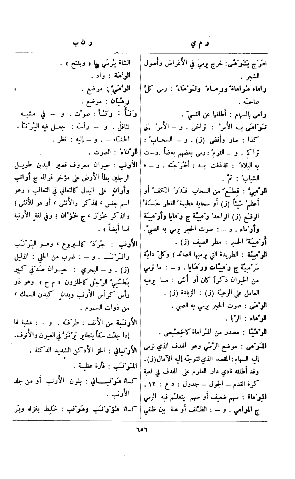 الأرنب" جرذ كاليربوع، وهو اليرنب والمرنب. و-: ضرب من الحلي: الذليل (ز). و-البحري: حيوان صدفي كبير بطني الرجل كالحلزون "م ح" وهو ذو رأس كرأس الأرنب وبدنٍ كبدن السمك، من ذوات السموم.