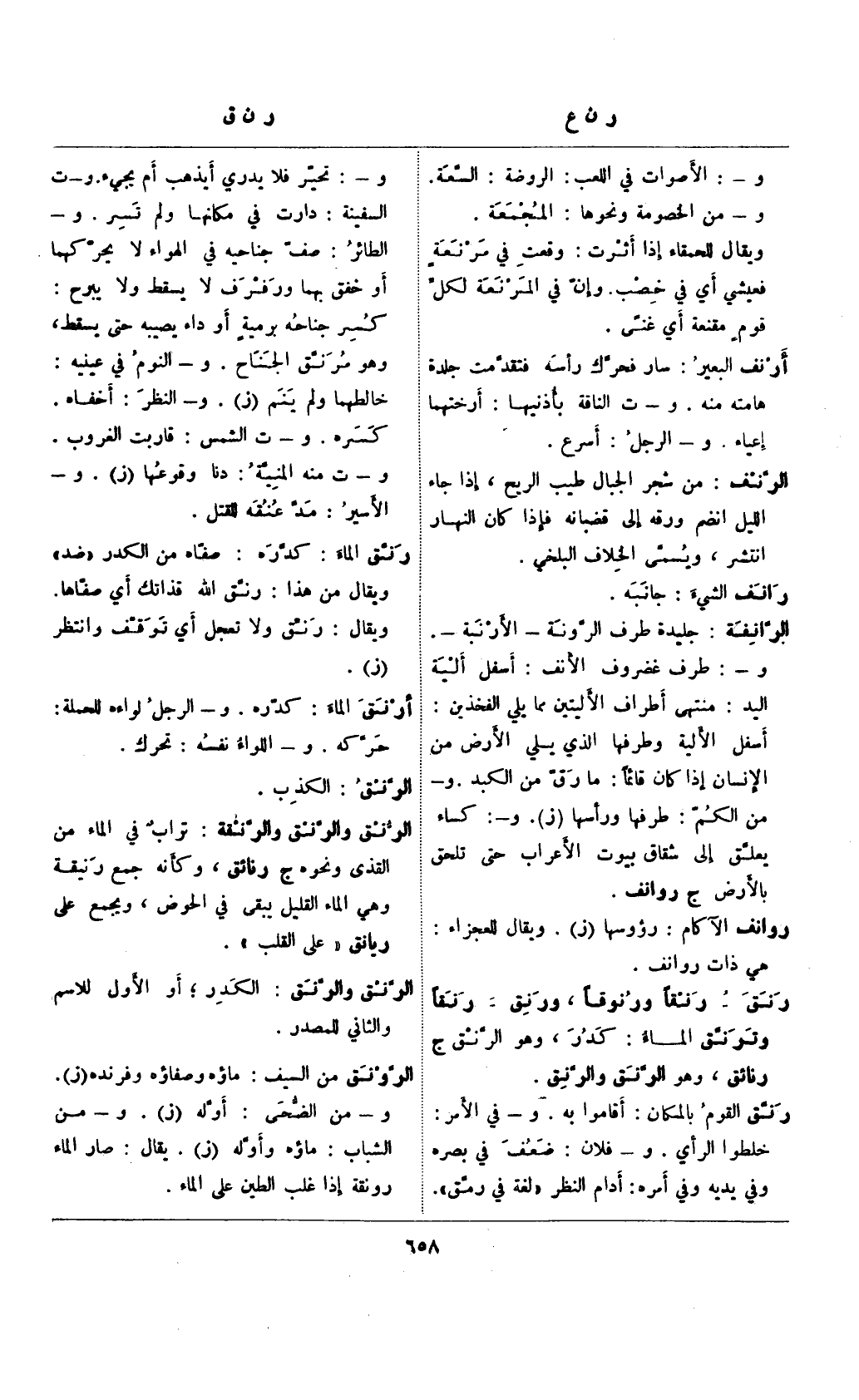 رنق: رنقاً ورنوقاً، ورنق: رنقاً وترنق الماء: كدر، وهو الرنق ج رنائق، وهو الرنق والرنق.