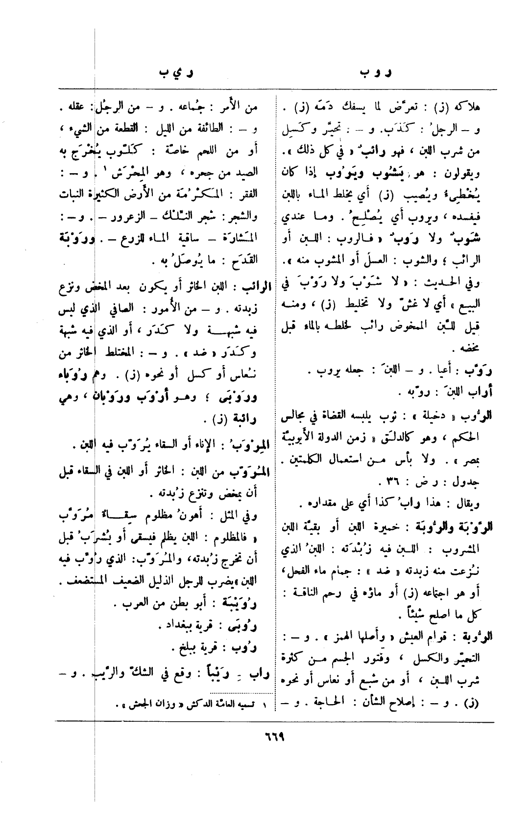 الرائب: اللبن الخاثر أو يكون بعد المخض ونزع زبدته. و- من الأمور: الصافي الذي ليس فيه شبهة ولا كدر، أو الذي فيه شبهة وكدر "ضد". و-: المختلط الخاثر من نعاس أو كسل أو نحوه (ز). وهم روباء وروبي؛ وهو أروب وروبان، وهي رائبة (ز).