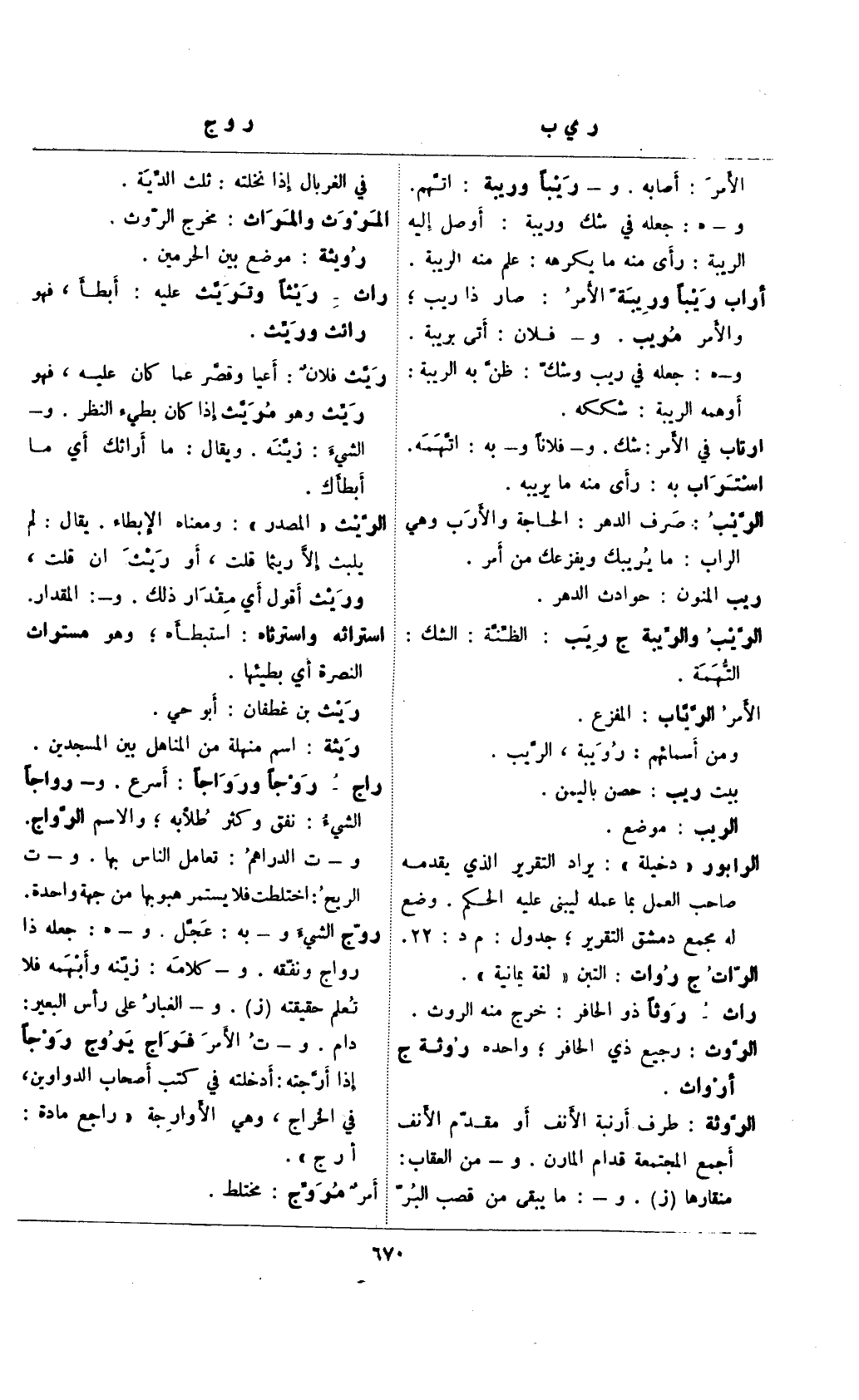 روج الشيء و- به: عجل. و-هـ: جعله ذا رواج ونفقه. و- كلامه: زينه وأبهمه فلا تعلم حقيقته (ز). و- الغبار على رأس البعير: دام. و-ت الأمر فراج يروج روجاً إذا أرجته: أدخلته في كتب أصحاب الدواوين، في الخراج، وهي الأوارجة "راجع مادة: أر ج".