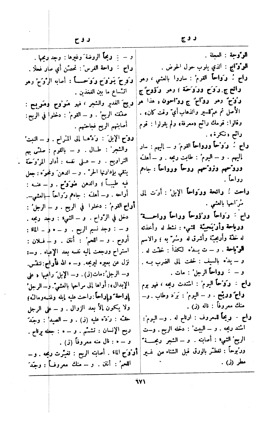 روح الإبل: ردها إلى المراح. و- النبت والشجر: طال. و- بالقوم: صلى بهم التراويح. و- على نفسه: أدار المروحة يتقي بإدارتها الحر. و- الدهن ونحوه: جعل فيه طيباً؛ والدهن مروح. و- عنه: أراح القوم: دخلوا في الريح. و- الرجل: دخل في الرواح. و- الشيء: وجد ريحه. و-: وجد نسيم الريح. و-هـ و- الماء: أروح. و- اللحم: انتن. و- فلان. استراح ورجعت إليه نفسه بعد الإعياء. و-: نزل عن بعير ليريحه. و-هـ الله فأراح: تنفس و- الرجل: مات (ز). و- الإٌبل راعيها "على الإبدال": أواها إلى مراحها بالعشى. و- الرجل إراحةً وإرحاحاً: راحت عليه إبله وغنمه وماله؛ ولا يكون إلا بعد الزوال. و- على الرجل حقه: رده عليه (ز). و- الصيد: وجد ريح الإنسان: تشمم. و-هـ: جعله يرتاح.