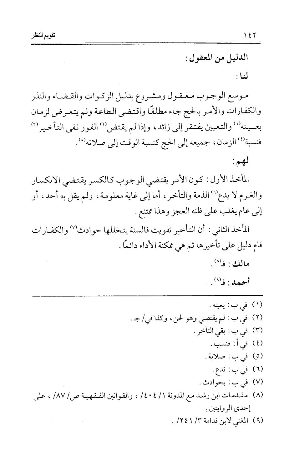 موسع الْوُجُوب مَعْقُول ومشروع بِدَلِيل الزكوات وَالْقَضَاء وَالنّذر وَالْكَفَّارَات وَالْأَمر بِالْحَجِّ جَاءَ مُطلقًا وَاقْتضى الطَّاعَة وَلم يتَعَرَّض لزمان بِعَيْنِه وَالتَّعْيِين يفْتَقر إِلَى زَائِد، وَإِذا لم يقتض الْفَوْر نفى التَّأْخِير فنسبة الزَّمَان، جَمِيعه إِلَى الْحَج كنسبة الْوَقْت إِلَى صلَاته.