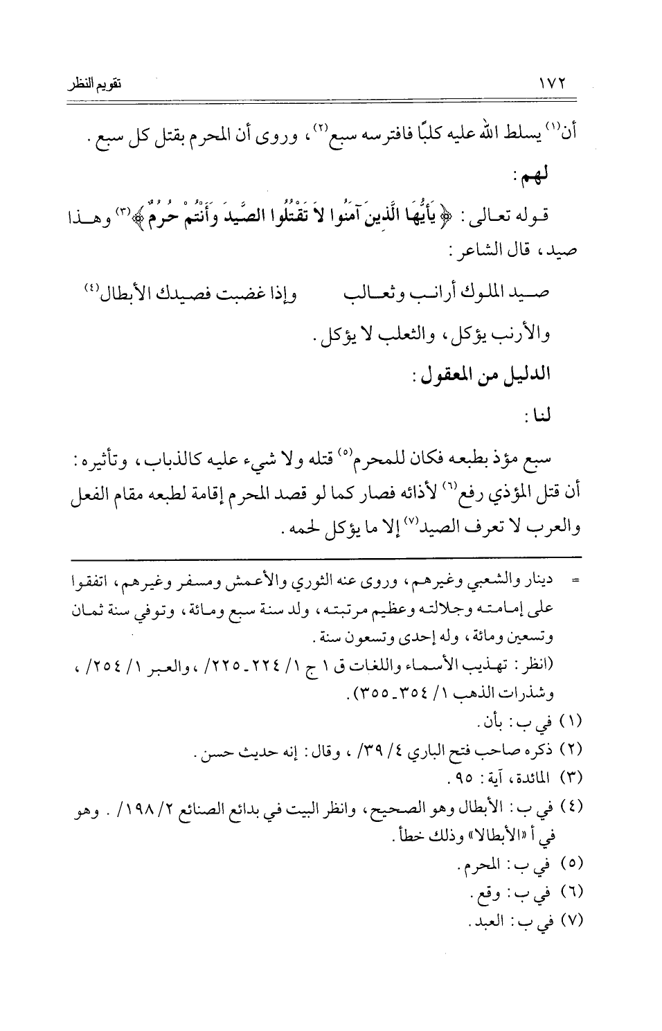 سبع مؤذ بطبعه فَكَانَ للْمحرمِ قَتله وَلَا شَيْء عَلَيْهِ كالذباب، وتأثيره: أَن قتل المؤذي رفع لأذائه فَصَارَ كَمَا لَو قصد الْمحرم إِقَامَة لطبعه مقَام الْفِعْل وَالْعرب لَا تعرف الصَّيْد إِلَّا مَا يُؤْكَل لَحْمه.