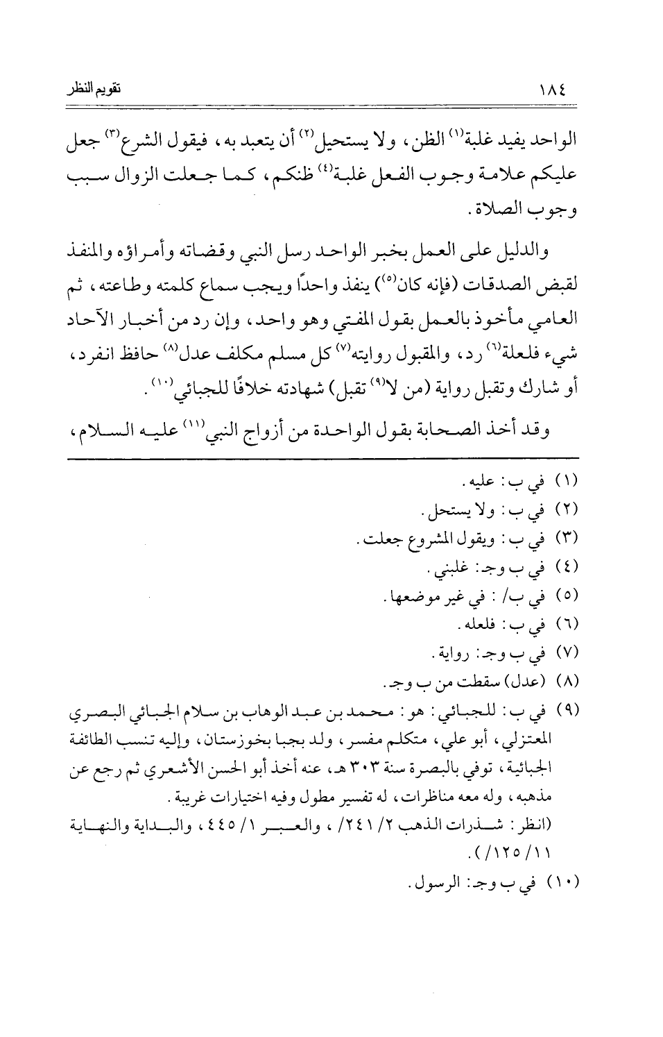 وَالدَّلِيل على الْعَمَل بِخَبَر الْوَاحِد رسل النَّبِي وقضاته وأمراؤه والمنفذ لقبض الصَّدقَات (فَإِنَّهُ كَانَ) ينفذ وَاحِدًا وَيجب سَماع كَلمته وطاعته، ثمَّ الْعَاميّ مَأْخُوذ بِالْعَمَلِ بقول الْمُفْتِي وَهُوَ وَاحِد، وَإِن رد من أَخْبَار الْآحَاد شَيْء فلعلة رد، والمقبول رِوَايَته كل مُسلم مُكَلّف عدل حَافظ انْفَرد، أَو شَارك وَتقبل رِوَايَة (من لَا تقبل) شَهَادَته خلافًا للجبائي.